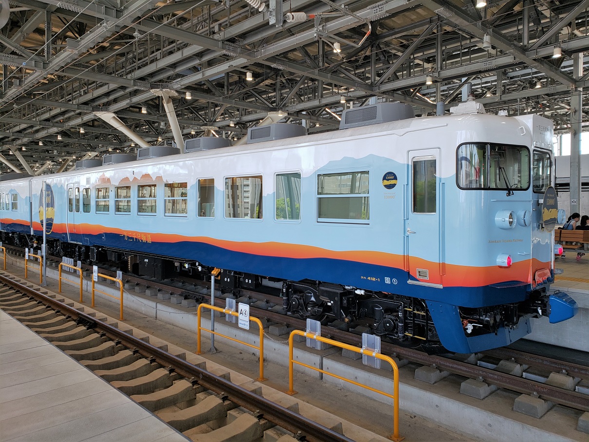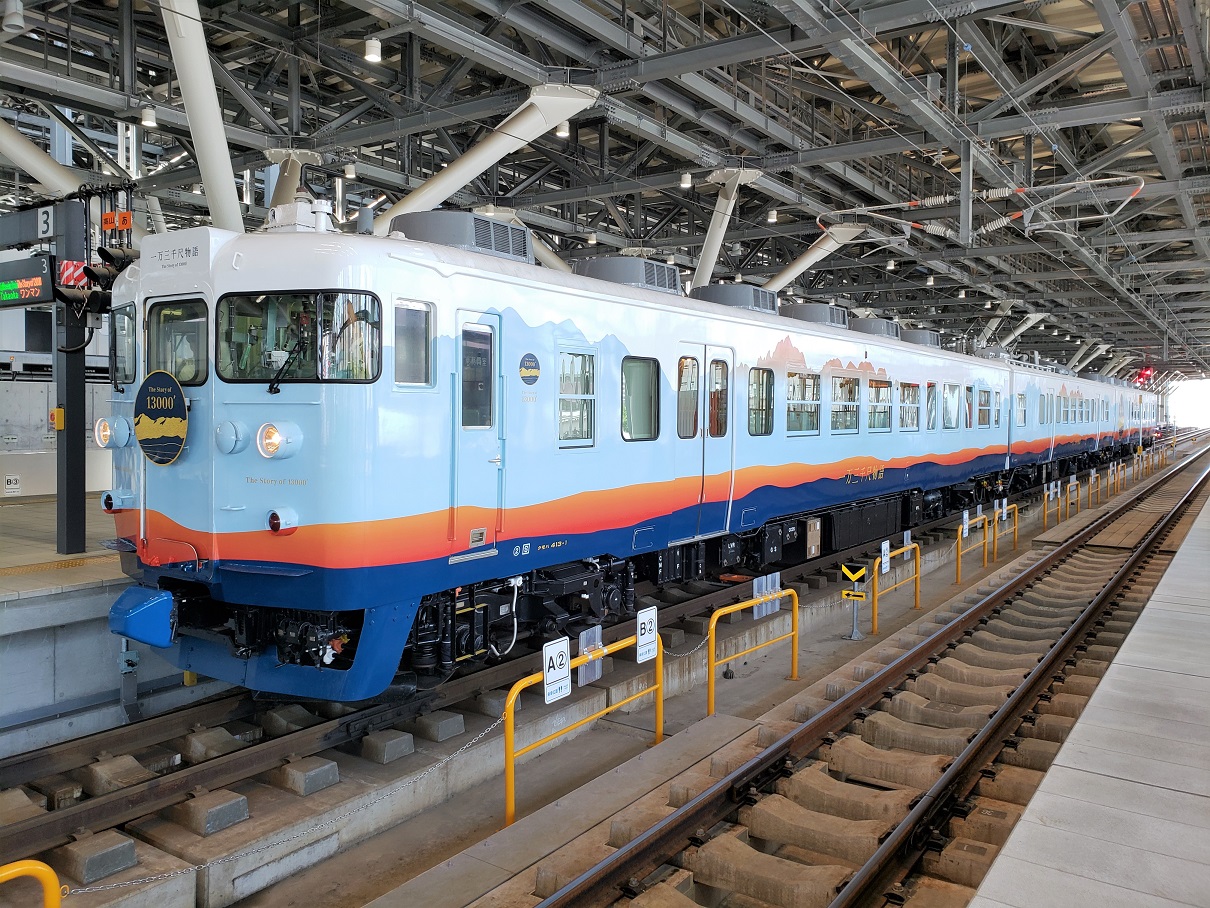 種車は413系のトップナンバーであるAK01編成。車両のデザインも立山連峰(車体大部分の水色)と富山湾(車体下部の深青)をイメージしたものになっています。流石に軽々と乗車できるような値段のプランはありませんが、富山訪問時の1つの贅沢として行程に組み込んでみてはいかがでしょうか。