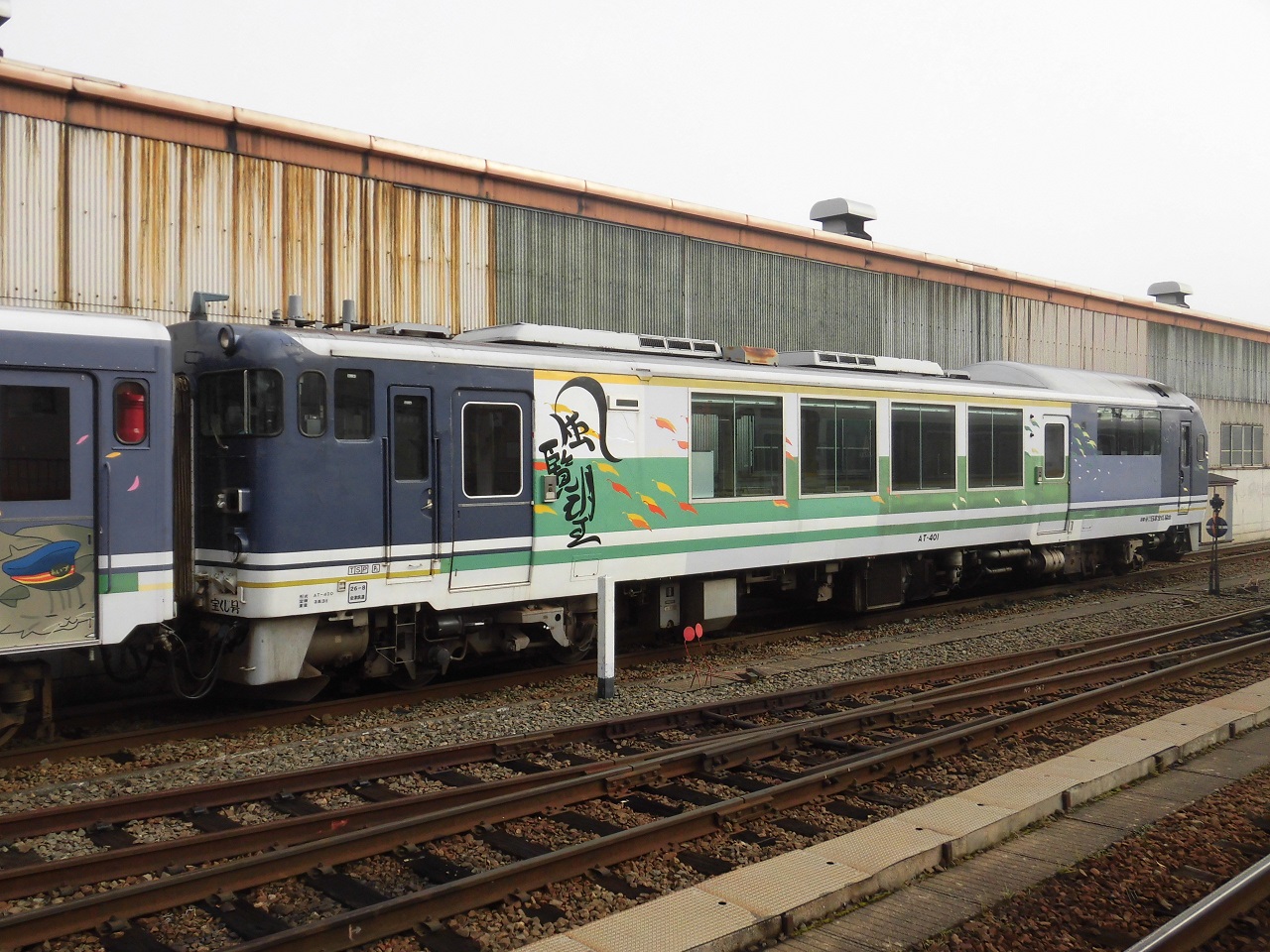 AT-300型でトロッコを導入し、AT-100型の改造でお座敷車を導入した会津鉄道がそれに続いて導入した展望型車両で、種車はJR東日本のキハ40-511。とてもキハ40には見えない改造っぷりは見事ですね。導入当初は車体の1/3がハイデッカー構造、2/3が一般客室とされていましたが、2016年にお座敷車のAT-103が引退したことから、一般客室の部分がお座敷に改造されています。愛称は「風覧坊(ふうらんぼう)」。