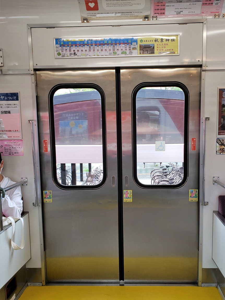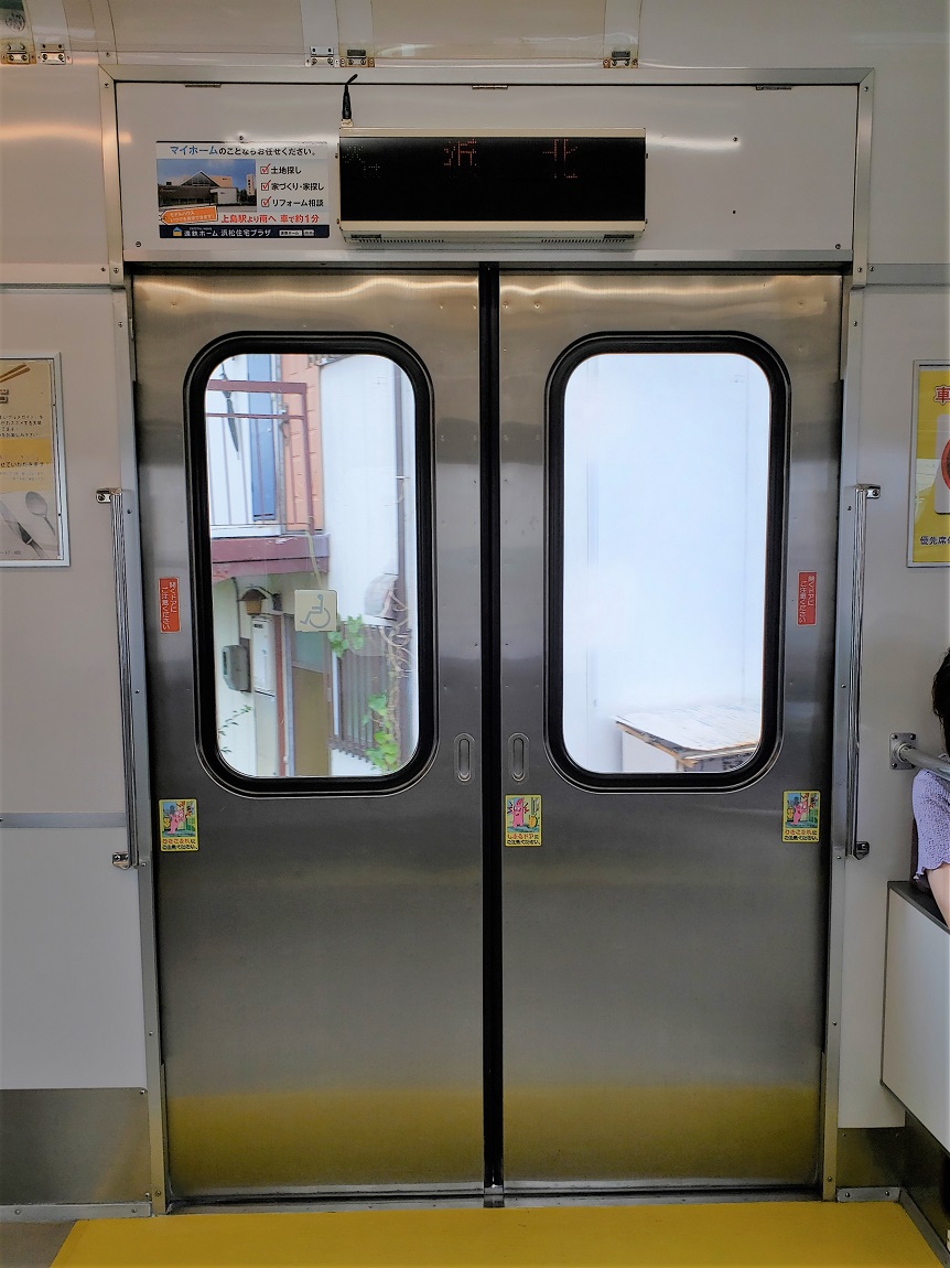 ・1000形ドア開閉(youtube) これといって何の特徴もない扉で、動きも凡なもの。敢えて言うなら少し動く音がガラガラとうるさいかもしれません。最大の特徴は扉上の案内表示器がバス用のものになっていること。これはのちに増備された2000形も同様です。 |