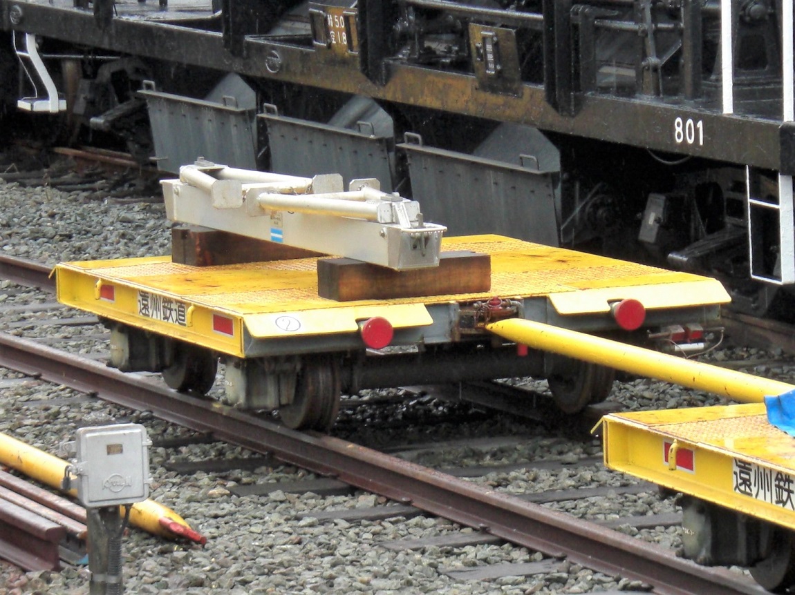 レール輸送車 こちらもよくあるレール輸送車。恐らく↑のモーターカーの牽引で用いられているのでしょう。 一応微かに車両番号があるようです(左は@)。 (全て遠州西ヶ崎にて) |