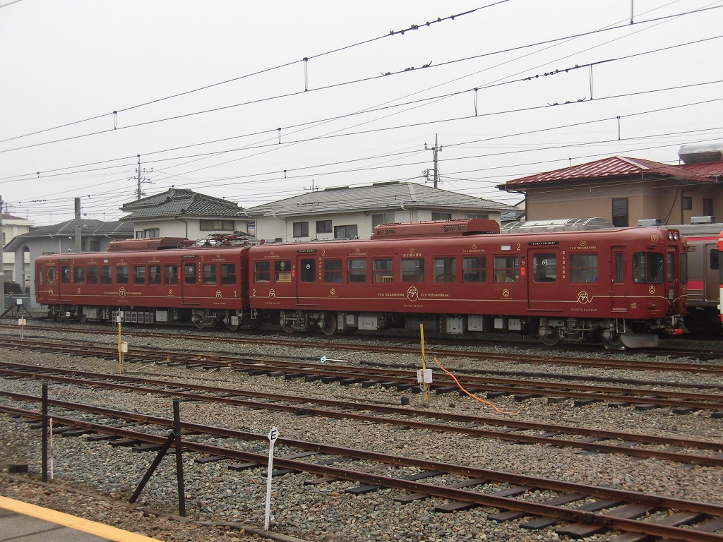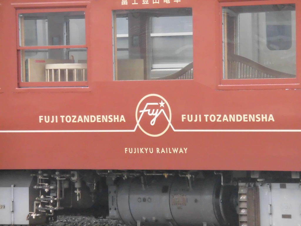 初代「マッターホルン号」塗装となっていた1200形の1205編成を観光列車に改造したもので、仕掛け人は毎度おなじみ水戸岡鋭治。2両編成の車両にはそれぞれ「赤富士」「青富士」の愛称が設けられています。塗装は開業当初の車両に塗られていた「さび朱色」をイメージしているとの事。言われてみれば、河口湖駅前にいるモ1形の色味に似ている気がしますね。