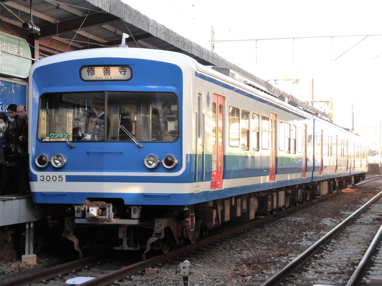 ・3000系走行音 【駿豆線】伊豆仁田→原木(2分34秒:841KB) 鋼製車もステンレス車も変わらず抵抗制御で、取り立てて特徴のある音ではありません。ドアチャイムは東海道新幹線タイプのチャイムを用いています。自動放送に英語が設けられているのも特徴。…と、大雄山線の5000系と大差ありません。 ただ、駿豆線は大雄山線と比べれば速度を出す区間も割とあるので、走行音を取るならこちらの方が良いかもしれません。単線故、駅到着前にかなり減速してしまうのは難点ですが。 |