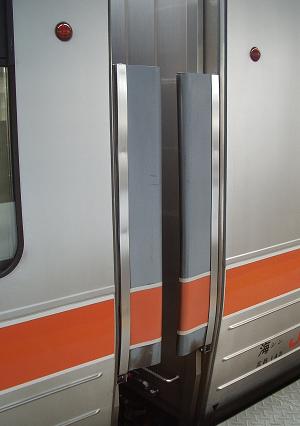 ・313系 ドア開閉(youtube) 基本的には、JR西日本の223系等と同じような、窓の大きな扉なのですが、窓枠の形や化粧板の色、そして扉上の案内表示やドアチャイム等、違いは非常に多く、パっと見の-印象以外は全く異なります。減圧機構が付いており、扉が閉まった後空気が抜ける音がして、5秒後くらいに完全に扉が閉まる、という仕組みになっているようです。 |