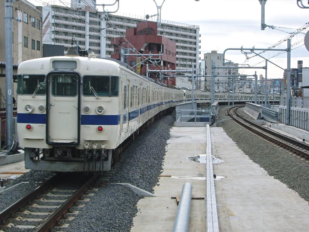 | 415系(1500番台)走行音 【常磐線】勝田〜水戸(8分30秒:2.70MB)…K532編成にて ステンレスの415系である1500番台の走行音。ただ、車体が新しくなっても走行機器は全く変わらないので古い抵抗制御の走行音のまま。走行機器が古いことを考えると今後のJR東日本での活躍はちょっと危ないような気もしてきます。 |