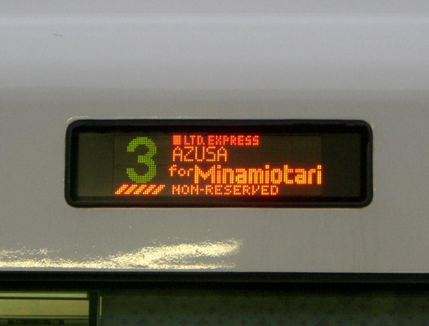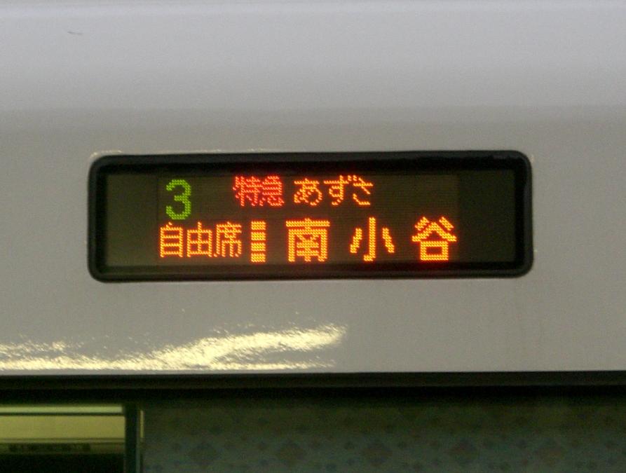 ・E257系車内放送 ・あずさ(0番台) まもなく錦糸町(次は新宿)(40秒:221KB) まもなく新宿(次は立川)(26秒:146KB) 新宿発車 次は立川(4分22秒:1,39MB) まもなく立川(次は八王子)(56秒:307KB) まもなく八王子(次は大月)(36秒:199KB) 255系のように専用のチャイムがあるわけでもなく、JR東日本の特急型車両としてはお馴染みのチャイムと放送です。尚、何故か錦糸町到着と新宿到着の放送は上手く録れずボコボコした音声になってしまっているので、お聞きの際はご注意ください。 |