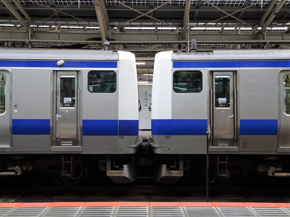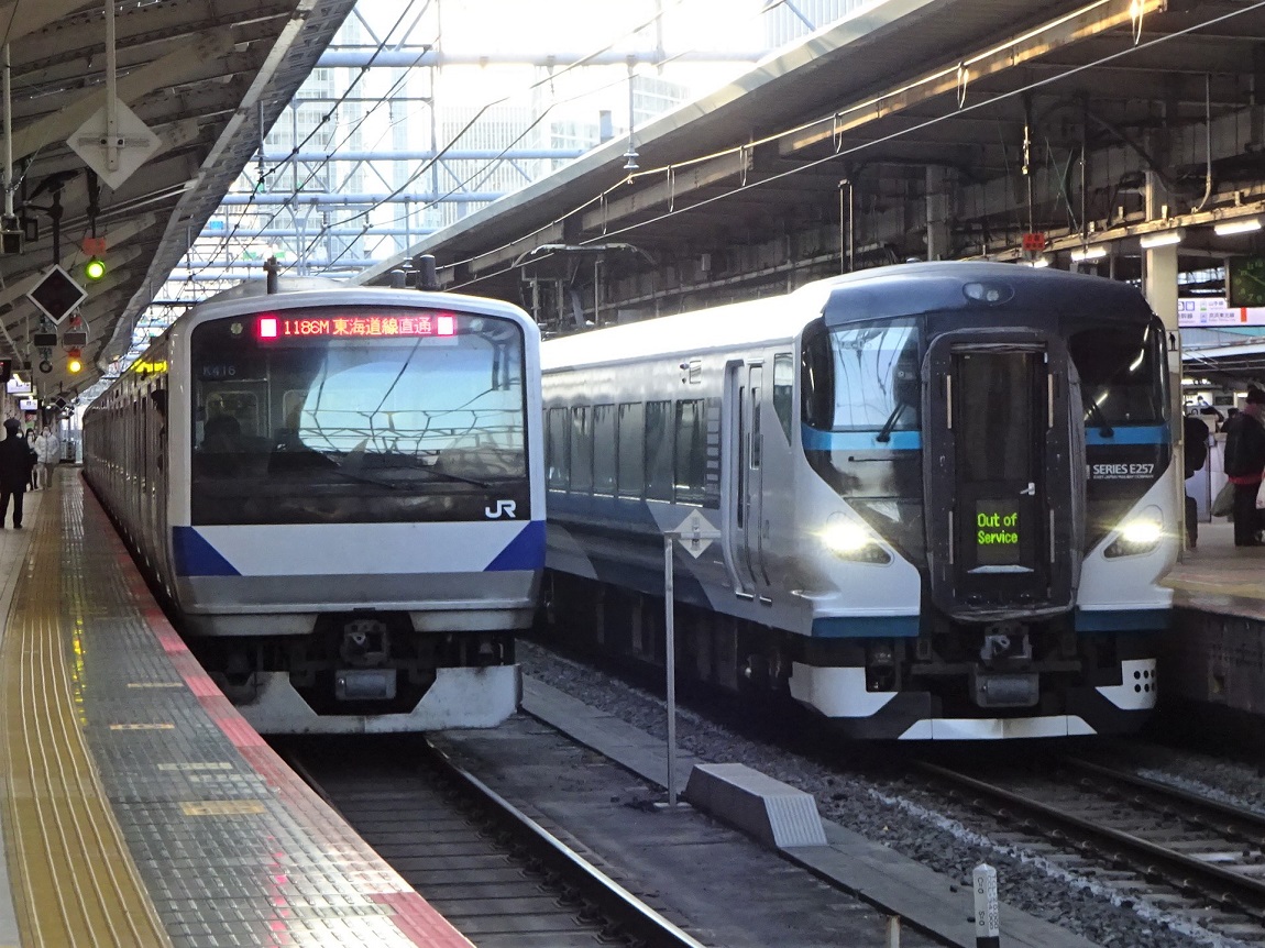 老朽化した403系および415系を置き換えるために登場した車両。最高速度は130km/hで、これはJR東日本の一般型車両では初めてのこと。特別快速のみならず、普通列車でも駅間が長い区間では130km/hでの運用があるようです。車内の見てくれはE217系に似ていますが、若干イスや吊り革、扉などに変化が見られます。尚、側扉中央部分に警戒帯が貼られた車両は、E531系が初めて。 この車両が登場してしばらく経った頃、常磐線にもグリーン車が連結されることになり、グリーン車を連結していない415系1500番台およびE501系は少なくとも土浦まで行かないと見られない存在になってしまいました。現在、土浦以南の運用は全てE531系とE231系で賄われています。上野東京ラインの開業に伴い、常磐線の列車も品川まで直通するようになりました。E231系・E531系双方が乗り入れますが、E531系は基本的に昼間の運用に充当されているようです。 この他、東北本線の交直流区間の切り替えに伴い、東北本線の黒磯〜新白河間の運用にもE531系が充当されるようになり、それに合わせて3000番台が新たに製造されました。といっても、見た目的には側面のルーバー程度しか違いはありません。東北本線固定運用なのかと思いきや、普通に常磐線の運用にも入っています。黒磯〜小山間の回送分の運行をどうにかできればいいのですが…。 上写真は田町にて。 |