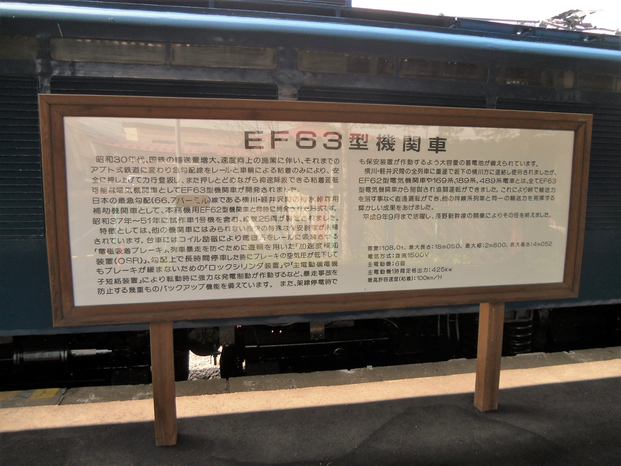 信越本線の横川〜軽井沢間のいわゆる「横軽」と呼ばれる区間の補機として登場した車両。基本的にEF64やEF65とかとも似たスタイルですが、前面の窓とかが角ばっているのが特徴的です。この車両の登場まではアプト式のレールを用いて運用を行っていた(そこで活躍していたのがED42やED40など)のですが、この車両の登場によりそのアプトレールの必要がなくなったことは大きな進化。渋い外見なども相まって鉄道ファンからの人気も高い機関車だったと言えるでしょう。 1997年に長野新幹線の開業により横川〜軽井沢間は廃止されてしまい、それによりEF63も現役を退きましたが、現在は横川鉄道文化むらに数両保存されており、動態保存をされている車両もあるなど、引退後も愛されていて嬉しい限り。 上写真は1号機。横川鉄道文化むらにて。 |