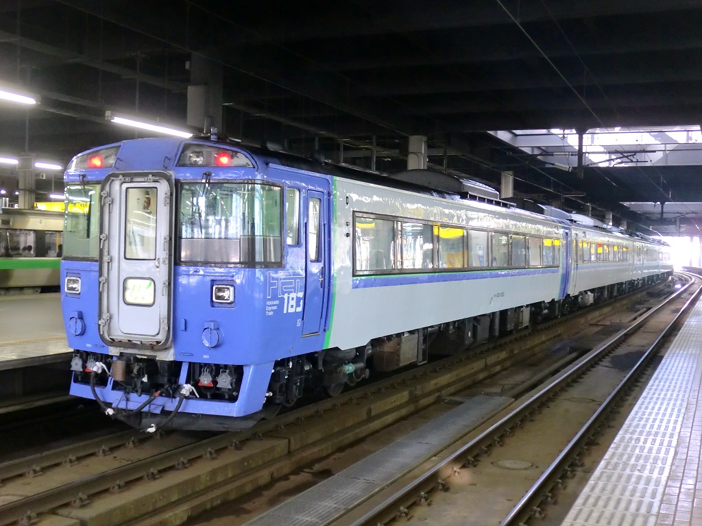 キハ183-1554先頭 特急「オホーツク」札幌発車(youtube) オホーツクは、2014年現在未だにキハ183系で運行されている特急の1つ。だいたいの場合、片方の先頭が非貫通、もう片方の先頭が貫通型…という編成で運行されているようです。稀に両方の先頭が非貫通の事があります。個人的には、その方が塗装も揃いますし見栄えは良いように思います。 オホーツクの編成は、半室グリーン車のキロハ182が連結されているのが特徴なのですが、時々連結されないこともあるようなので注意が必要です。 |