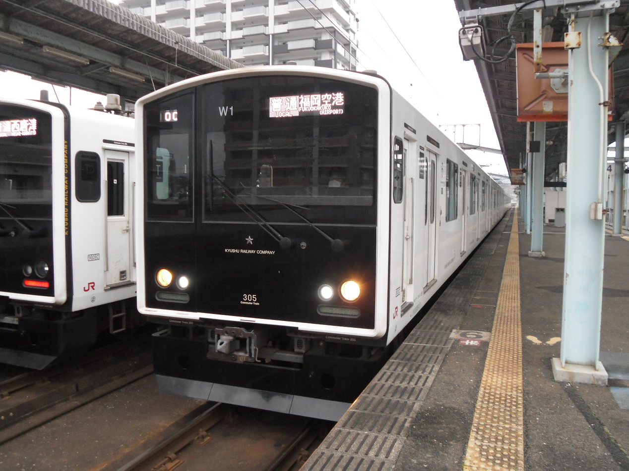 | 305系 東比恵発着(youtube) 到着がW5、発車がW3編成となります。 JR九州の車両として初めての東芝PMSM搭載車となった305系。実に特徴的で面白いモーター音を立ててくれるので趣味的には面白い車両でもあります。ドアチャイムこそJR東タイプになってしまいましたが、内装はJR九州らしさが見て取れるのも好印象。 |