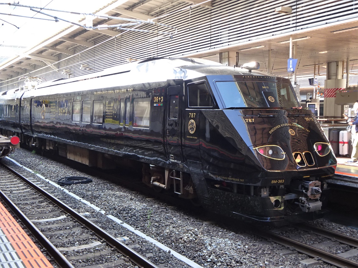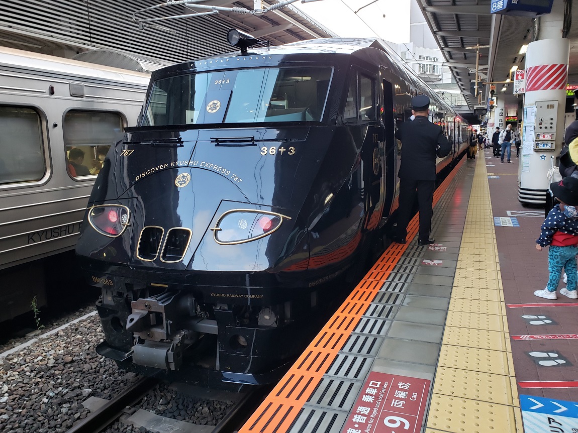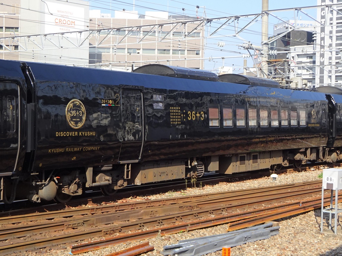 | 「36ぷらす3」博多発車(youtube) 787系をフル改造し、九州各地を巡る観光列車(日によって運行ルートは違う)として運行を開始した36ぷらす3。何よりもその真っ黒な車体に金色のエンブレムのアクセントがとても魅力的な見た目をしています。内装は完全に水戸岡さんテイストになっているようです。お金に余裕があれば乗ってみたいものです…。 |