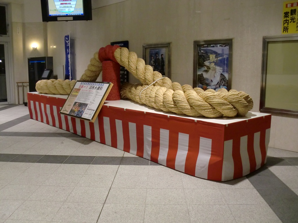 「日本一!川内大綱引」とのことで。そういった伝統行事があるので、それにちなんで縄を使用した、ということのようです。写真ではあまりよくわからないかもしれませんがこの縄、とんでもない大きさでした。持つだけで大変そう。 |