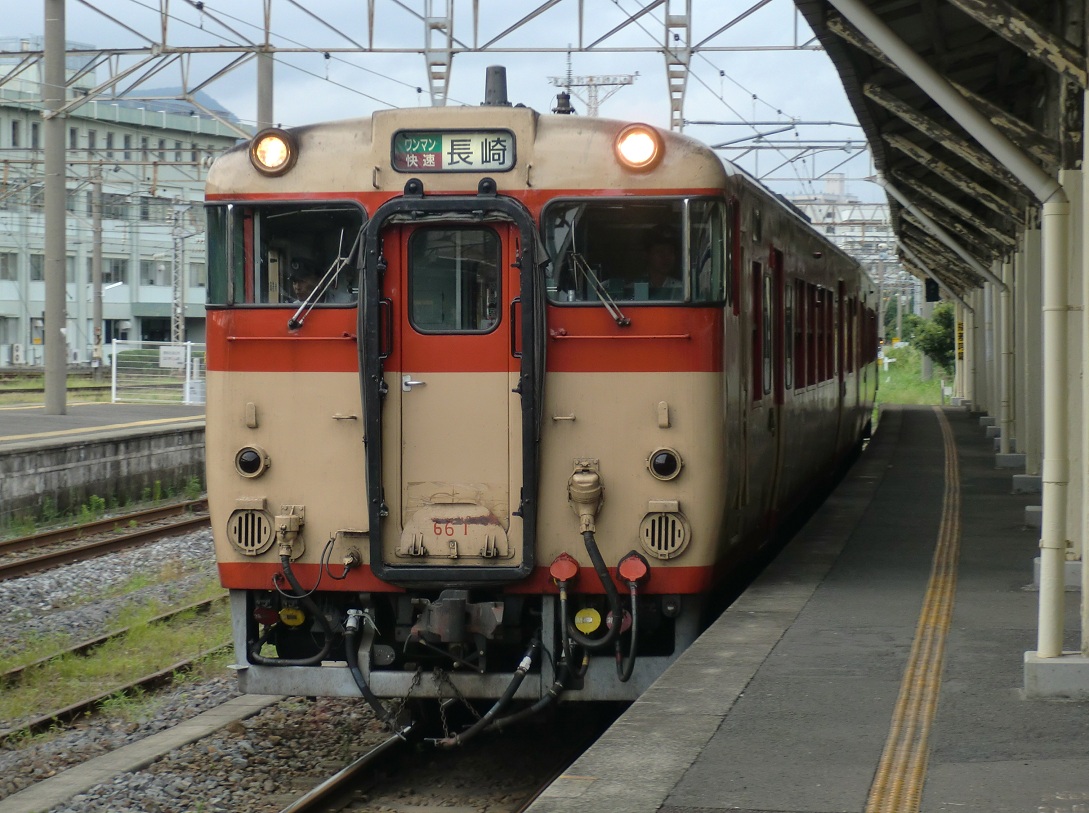 | 2011年に登場当時の急行色に復刻された第10編成は、塗装変更と同時に台車の交換を行ったことにより、元番号に100を足してキハ66-110、キハ67-110となりました。 撮影地:長崎 |