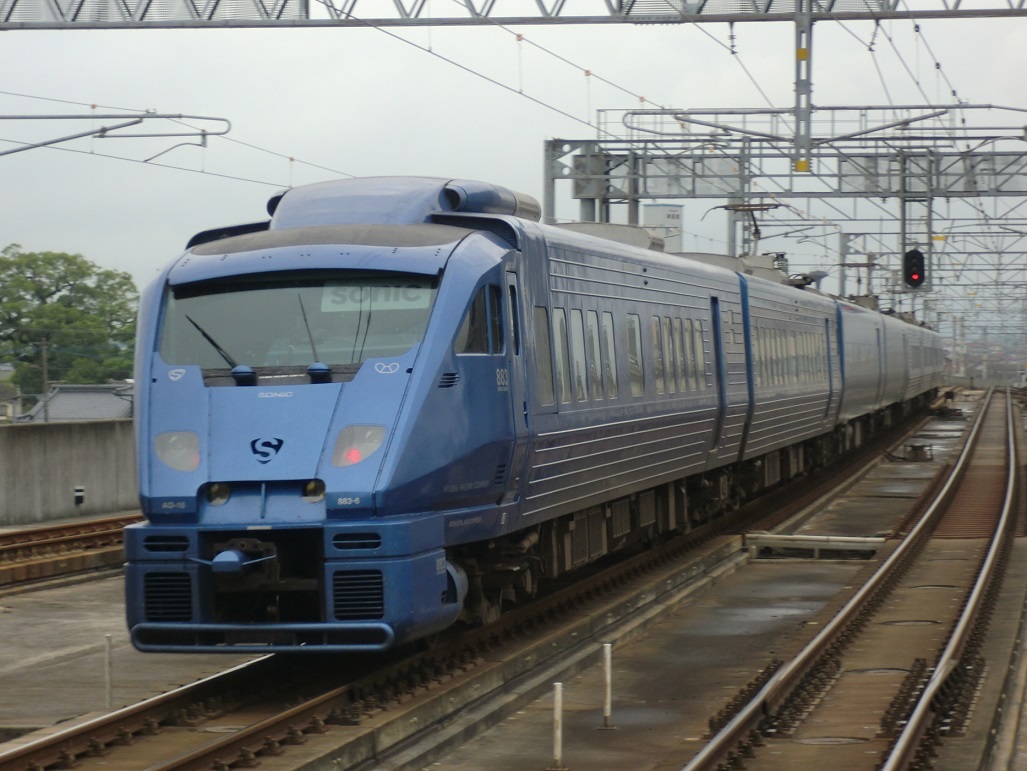 1995年に登場した特急形車両で、「ワンダーランドエクスプレス」の愛称があります。特急「ソニック」の殆どの列車で運用されており、見る事自体は簡単です。車体デザインは勿論、水戸岡鋭治によるもの。車内レイアウトは「楽しさ」がコンセプト。見ても乗っても楽しい車両となりました。 2005年より更新が施され、この時に車体塗色が青一色に変更されました。2007年には編成増強(5両→7両)を行うため、885系に準じた車体の中間車が一部増備され、そちらは1000番台に区分されています。 上写真はAO-16編成、行橋にて。 |