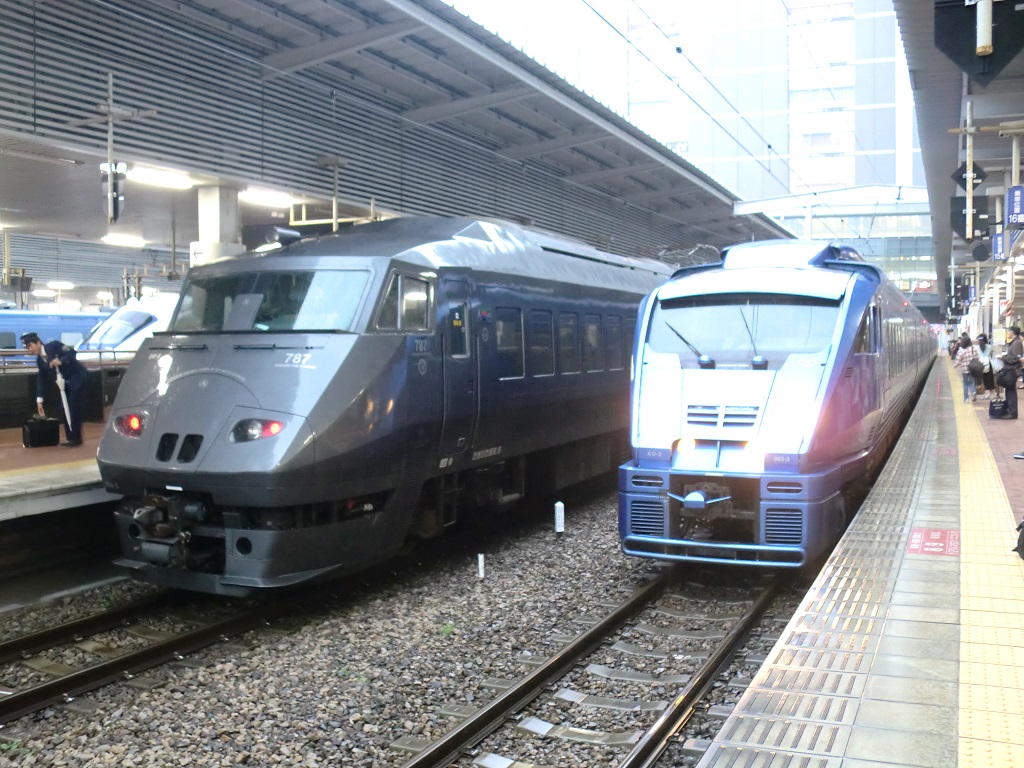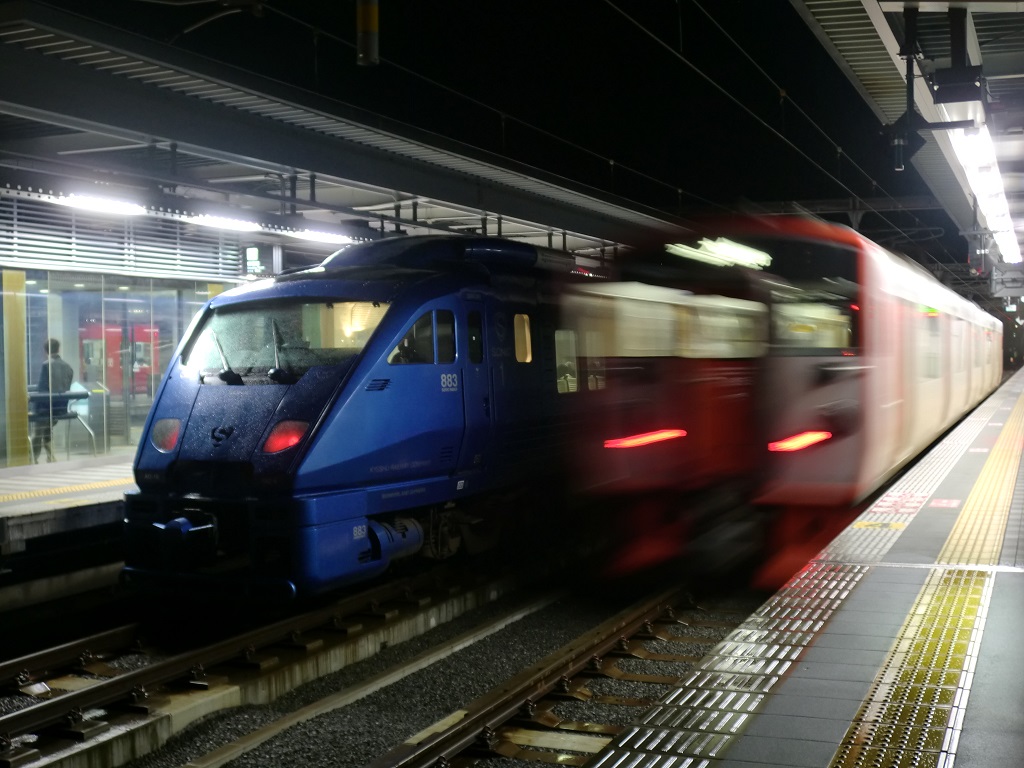 883系AO17編成博多発車 883系の7両編成化に伴い、885系に準じた車体の中間車が一部新たに製造されました。その車両を組み込んでいる編成は全部で3編成。2両だけ車体もデザインも走行音も違う車両が混ざっているのはなんだか不思議な感覚です。 |