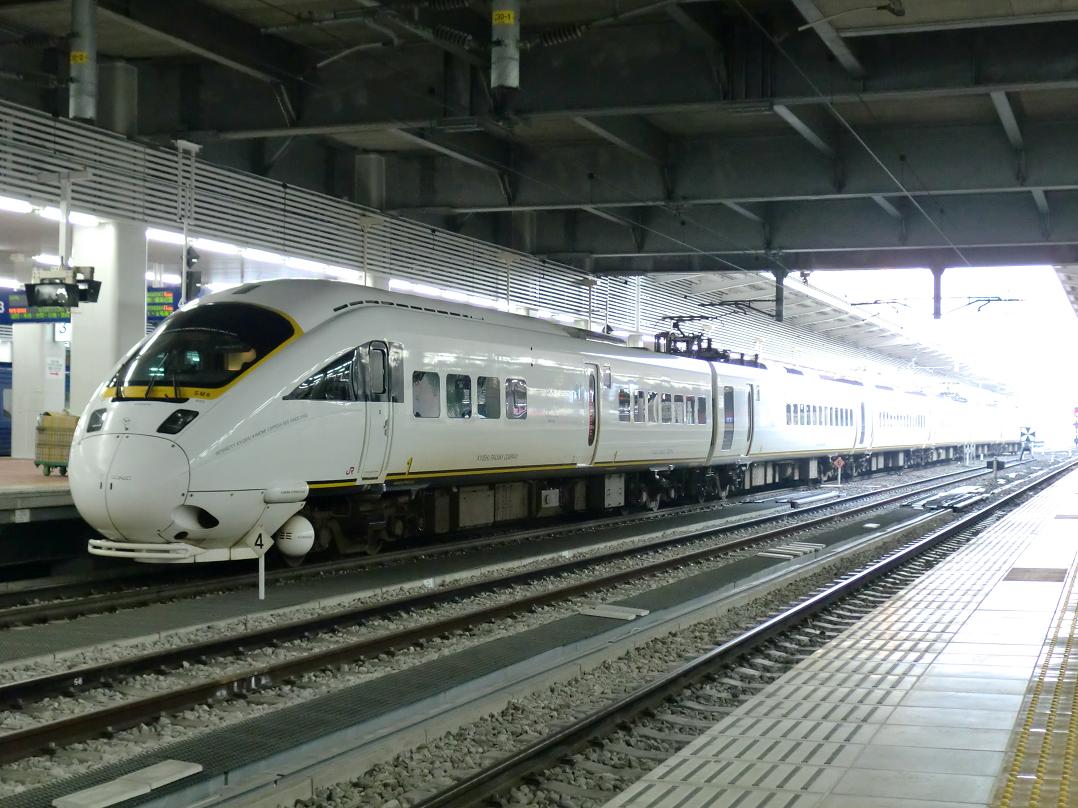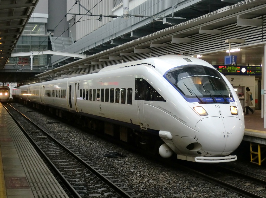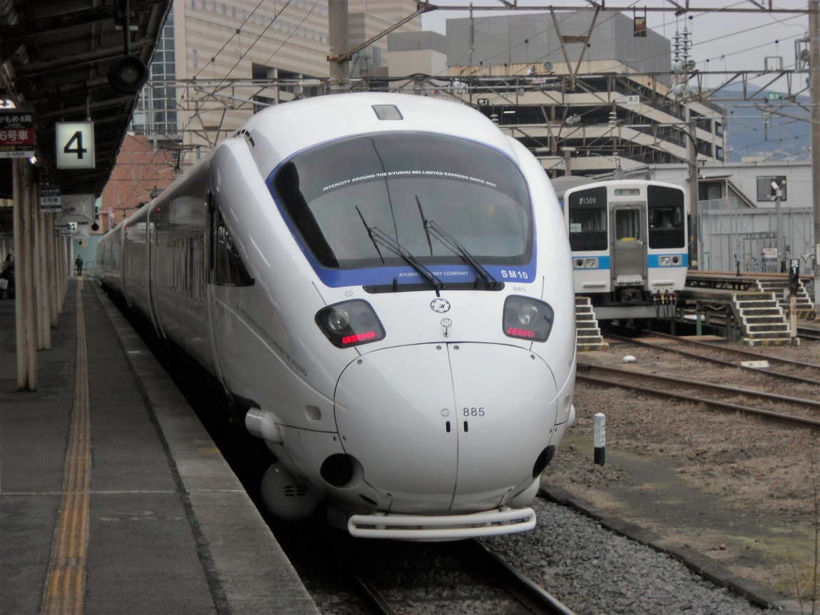 2000年に登場した特急形車両で、783系および485系の「かもめ」の運用の代替を目的として登場しました。デザインは勿論水戸岡鋭治。既に製造されていた883系とは全く異なるデザインとなり、ブルーリボン賞、ブルネル賞、グッドデザイン賞を片っ端から持って行きました。それも納得なデザインですね。 SM8(登場から8本目の編成)からは「ソニック」用に増備された車両で、見た目では黄色の部分が青に変わり、ロゴもソニック用のものに変更されたことと、前面のライトが変わったことが変更点となります。尚、かもめとソニックの双方に使用することから、一部の「かもめ」用編成にソニックのロゴが設けられたり、青色に変更されたりする編成も出ています。 上写真はSM6編成、博多にて。 |
