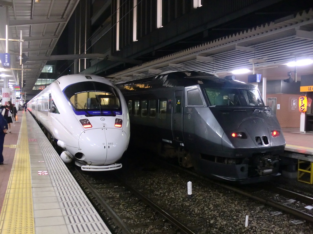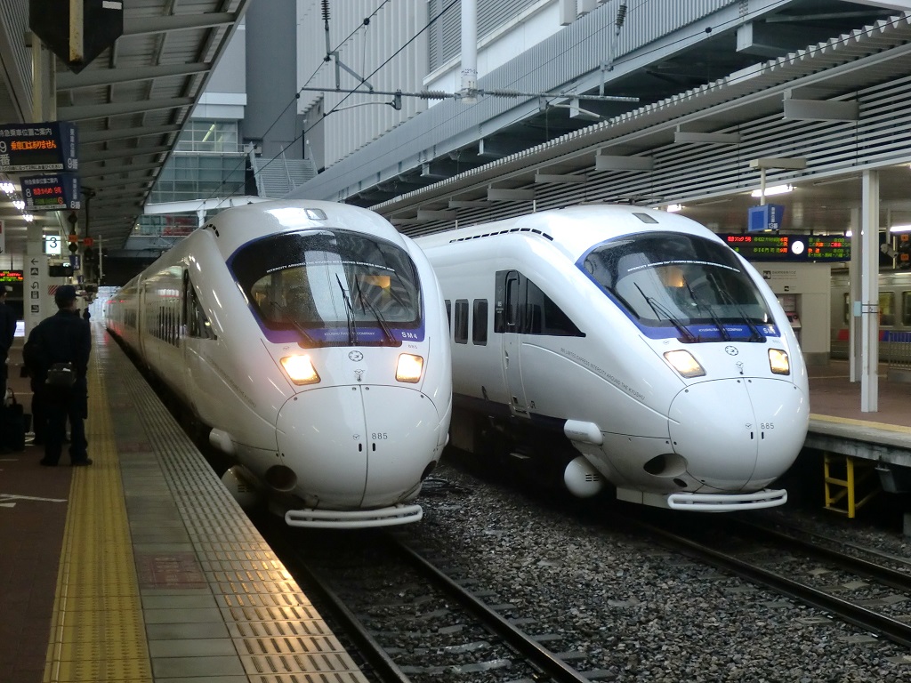885系SM10編成博多発車 特急「ソニック」用に追加でつくられた青い885系。ちょっと前面のライトが変わり、潤んだような目つきになりました。個人的にはこちらの方が好きだったりします。 いやー・・・九州行ったのはこれを見るためと言っても過言ではないくらい好きな車両だったので、見れて満足です。SDカードの容量に余裕もなかったのに、こうして動画を撮ってしまったのでした。 |