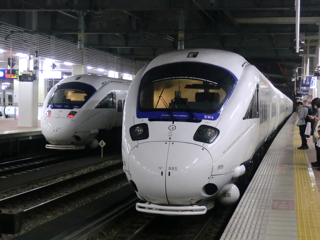 885系SM8編成博多発車 博多2番線から発車するお馴染みの構図。883系の「ソニック」では2度撮影しているので、今回は885系に対象になって頂きました。 |