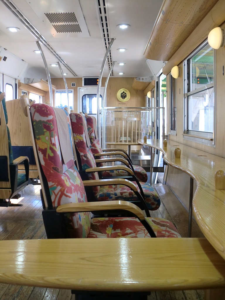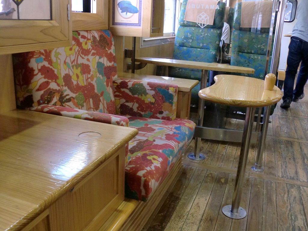 扉が開くと、このような演出が。列車名が「玉手箱」であることから玉手箱を開けた時の煙をイメージしているようです。扉の上に噴霧装置が組み込まれており、正体は水蒸気。扉が開いてから1分くらいはもつようです。 |