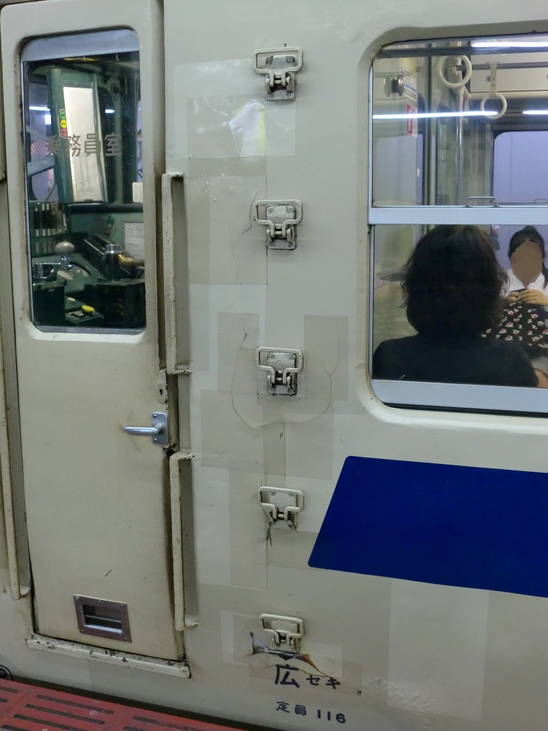 | さらに同じく下関所属のC-41編成は、瀬戸内色が最後まで残っていた編成で、両先頭車が初期車となっています。瀬戸内色の生き残りとして貴重な存在ですが、この編成とにかくズタボロな事でも有名で、塗装はツギハギな上、ビニールテープでサビを塞ぎ、方向幕だった場所は茶色く汚れ、前面幕のある場所は段ボールの様なもので塞がれています。見るからに満身創痍な姿でしたが、その分貫禄もあり下関車の「ヌシ」と言える存在でもありました。模型化されないかな(3回目)。 撮影地:広島 |