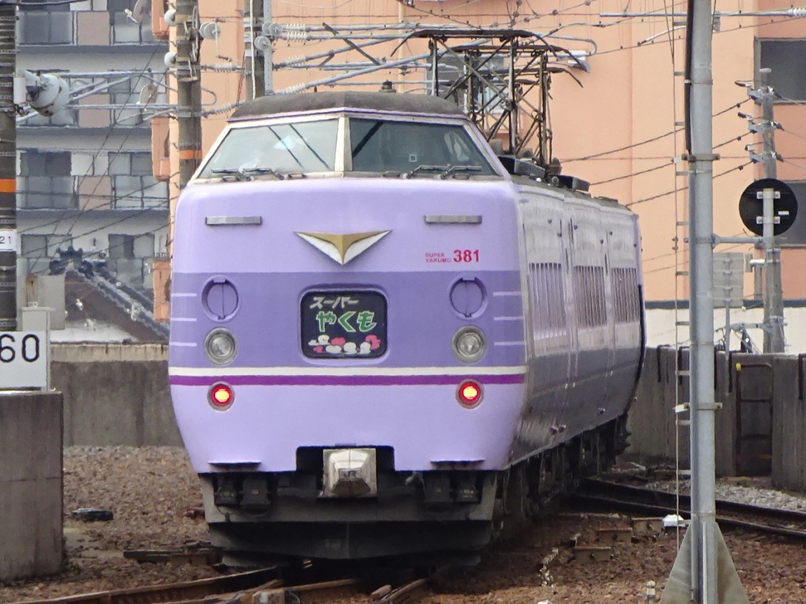 | ・381系(クモハ381-8先頭) 特急「やくも」 出雲市発車(youtube) 381系で運行される特急「やくも」。近年、全ての車両が「ゆったりやくも」に更新されています。編成が頻繁に組み替えられているので編成番号が存在していないようで、それに気づかずバシバシ写真を撮っていた自分は車両番号を調べるのに難儀しました...。 振り子式車両という事でいわゆる「船酔い」が起こりやすいとも言われていますが、自分が乗車した際は乗っていて気分が悪くなるという事は特にありませんでした。この辺りは個人差があるのかな? |