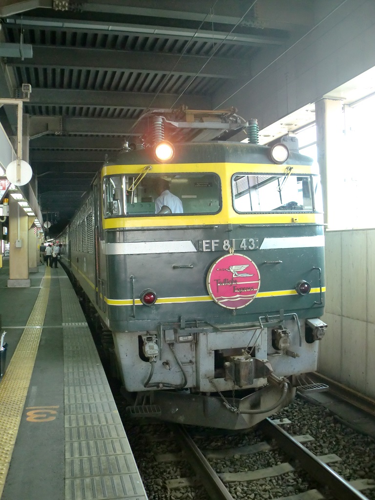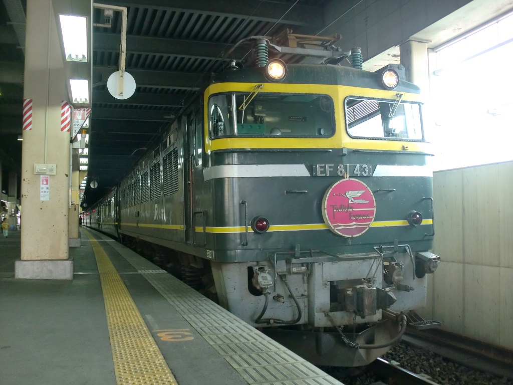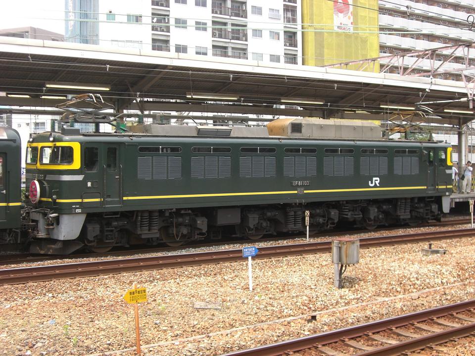 交流・直流両方に用いることのできる機関車として登場していたEF80の後継機。国鉄が民営化した際にはJR東、西、九、貨の4社に引き取られ、各社用途も塗装も様々な使われ方をしています。JR西日本では寝台特急「トワイライトエクスプレス」「日本海」の牽引機として有名ですが、どちらも既に廃止されており、今後どうなるのかは予断を許せない状況です。 JR他社のEF81はこちらから → JR東日本・JR貨物 上写真は大阪にて。 |