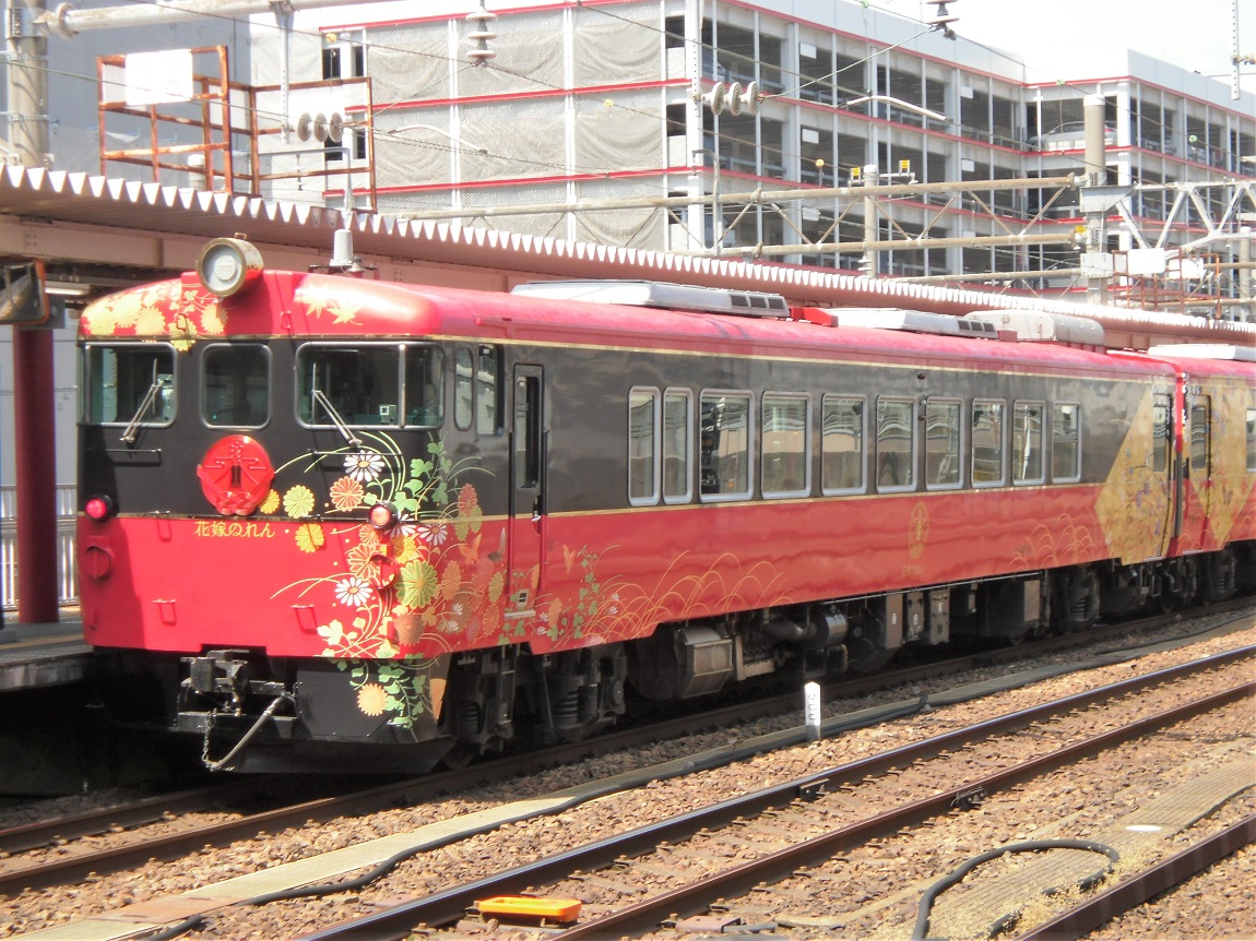 2015年より実施された「北陸デスティネーションキャンペーン」に合わせて、北陸新幹線の終着地である金沢駅を軸として2015/10/3より運行を開始した観光列車で、運行区間は金沢〜和倉温泉。金沢の伝統工芸品の展示や、北陸ならではの食の提供が施されています。「花嫁のれん」とは、所謂嫁入り道具の1つとして石川県を中心に根付いている伝統文化の事で、内外装共に北陸の伝統工芸である輪島塗、加賀友禅、金沢金箔、加賀水引等、北陸のイメージを体現したかのようなデザインが施されています。