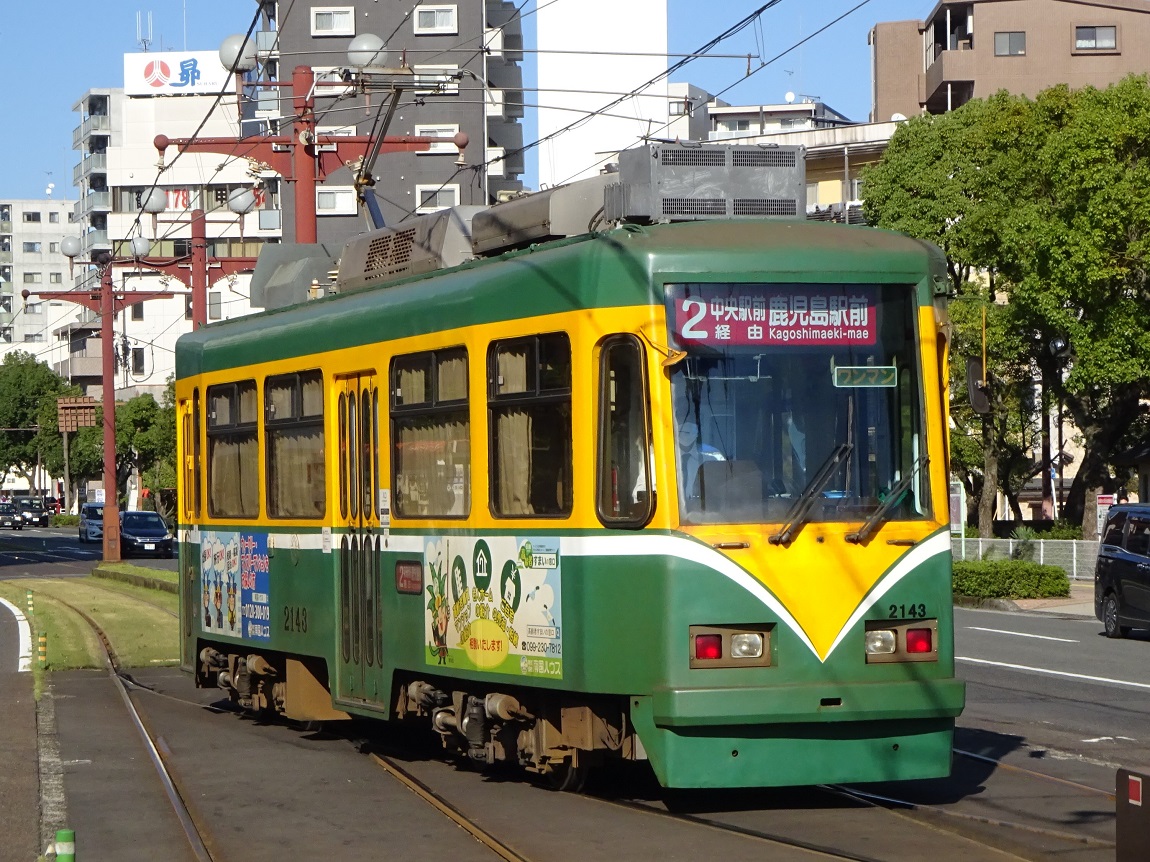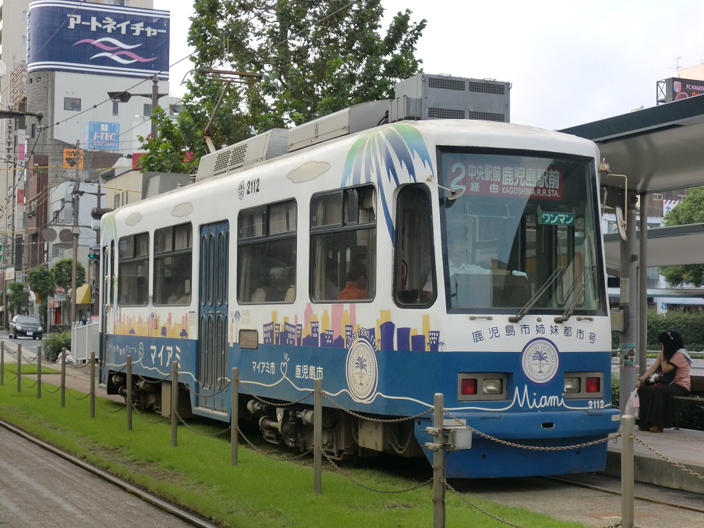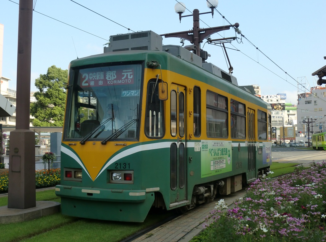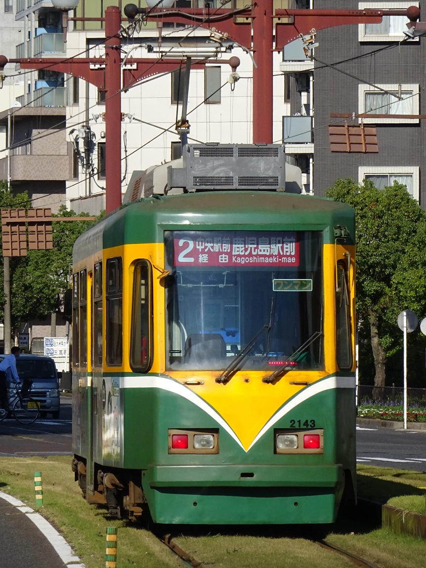 ・2132号 鹿児島中央駅発車(youtube) 2110形〜2140形は見た目も仕様もほぼ同様です。製造がJR九州、というのが一番の特徴でしょうか。塗装は鹿児島市電では伝統的な色。ちょっと形に似合わない気もしますがまぁ、これはこれで可愛くていいですね。 出発を録ったのはいいのですが、すぐに信号待ちで止まってしまいました。 |