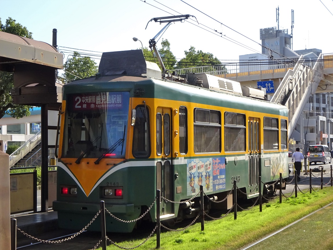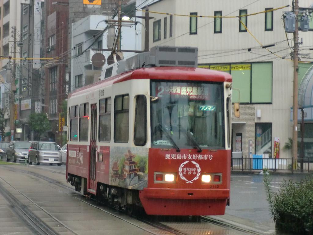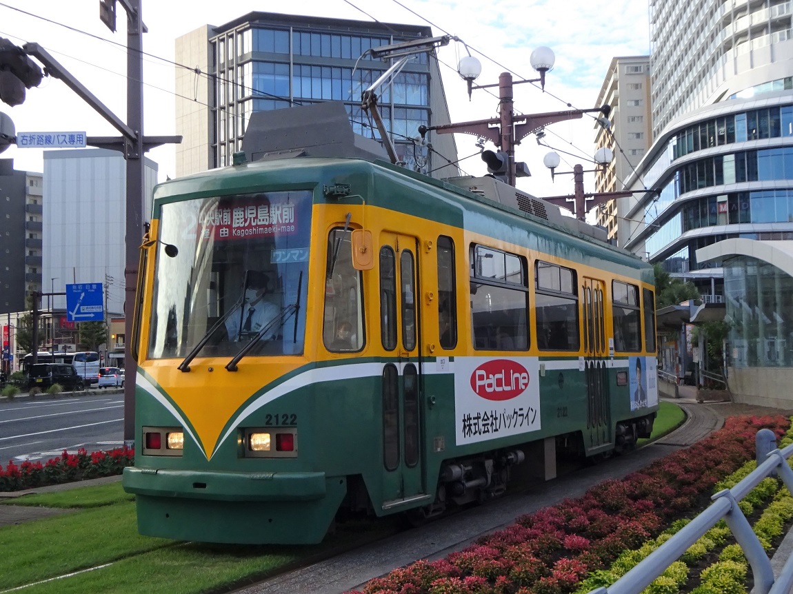 ・2132号 鹿児島中央駅発車(youtube) 2110形〜2140形は見た目も仕様もほぼ同様です。製造がJR九州、というのが一番の特徴でしょうか。塗装は鹿児島市電では伝統的な色。ちょっと形に似合わない気もしますがまぁ、これはこれで可愛くていいですね。 出発を録ったのはいいのですが、すぐに信号待ちで止まってしまいました。 |