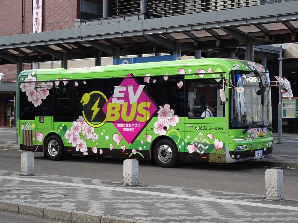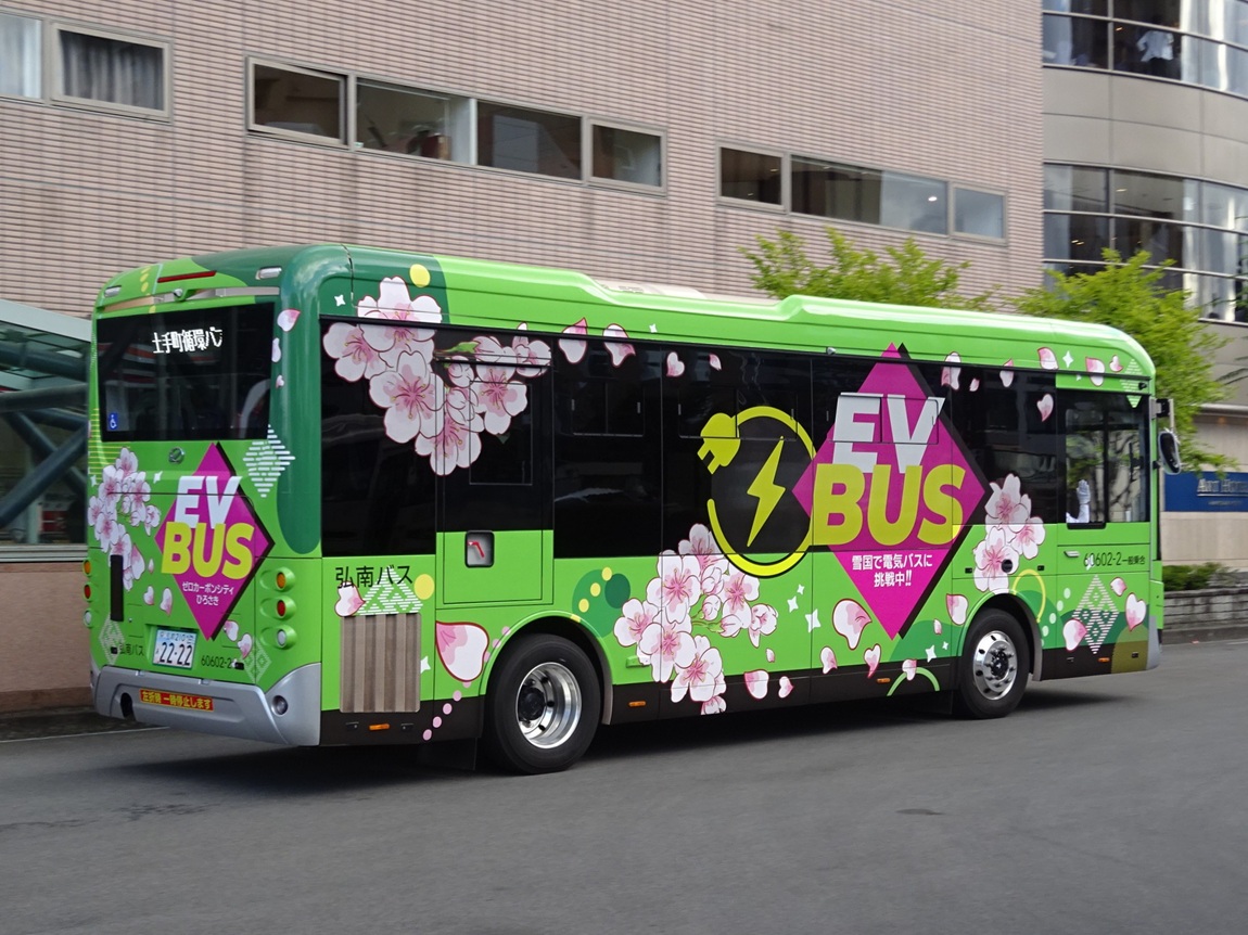 EVモーターズ・ジャパンは福岡県北九州市の自動車メーカー。中国メーカーに製造を委託した上で、日本国内向けに電気バスの開発・販売を行う形式をとっていましたが、後に国内に工場を製造し、国産の車両として製造する形に移行した…筈でした(後述)。このうち、一般的な路線バスとして登場したのが「F8 series2-City Bus」で、車体長は8,8mと10,5mの2通りがあります。弘南バスはこのうち8.8mを採用した全国2番目の事業者(1番目は鹿児島市営バス)になりました。大型バスを入れるほどの需要は無く、既存のEVバスに丁度いいサイズも無く、国産でもあり…と言う事での採用だったのかと思います。