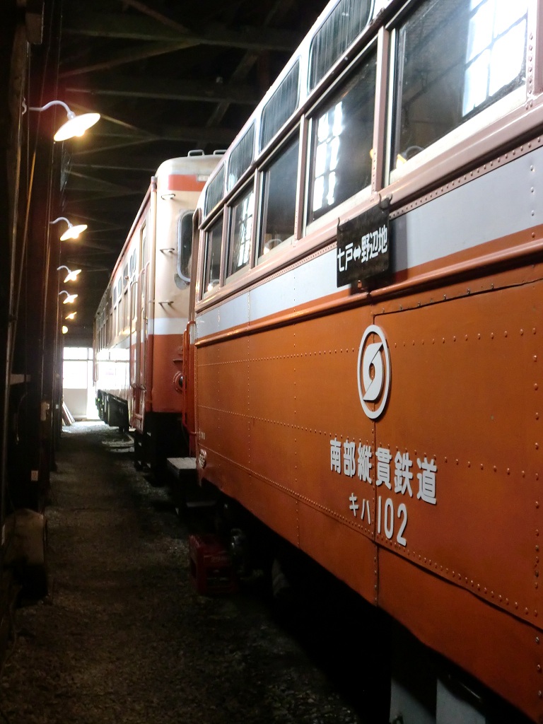 この車両は1962年に富士重工で製造されていた地方私鉄向け車両の一つで、「レールバス」という車両が当時は非常に珍しく、大きな話題となりました。その当時のバスの構造を基にしているため、現在第3セクター鉄道などで活躍しているレールバスとは大きく見た目が異なっています。警笛もバスのクラクションを用いていたとのこと。青森県の積雪地で運用されることから、スノープラウを装備しています。
