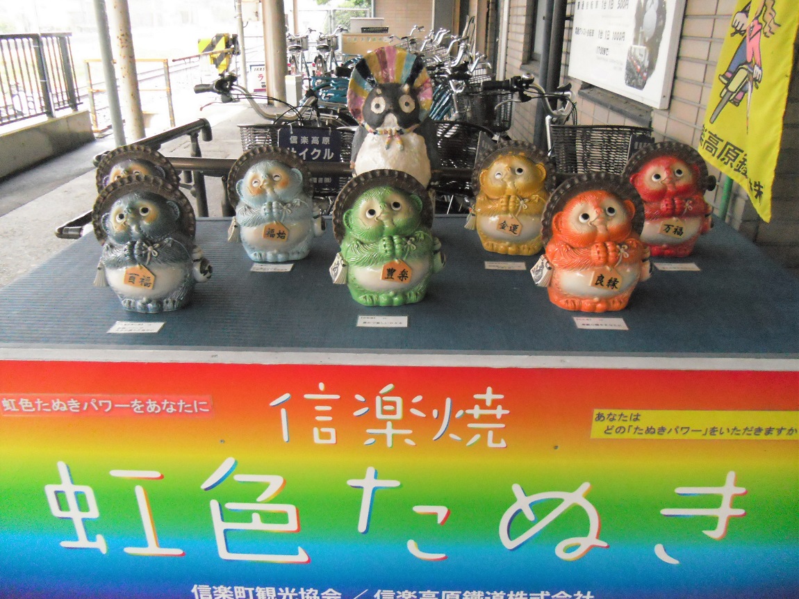 どうしても信楽高原鉄道というと痛ましい事故の記憶がある人が多いとも思いますが、現在の信楽高原鉄道は、至ってのんびりしたローカル線という風情で、信楽をイメージした狸、伊賀をイメージした忍者の装飾が施された車両や駅がなかなかよそには無い雰囲気を醸し出しています(※信楽駅の売店付近に件の事故に関する資料も展示されていますので時代背景を知りたい人は其方も…)。信楽駅構内は狸だらけ。駅周辺も本当に信楽焼だらけでそこら中に狸や梟が鎮座しているので歩き回るだけでもなかなか楽しい物です。