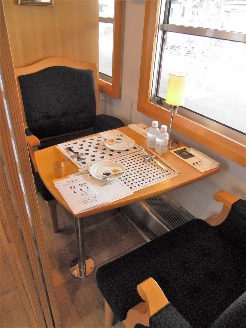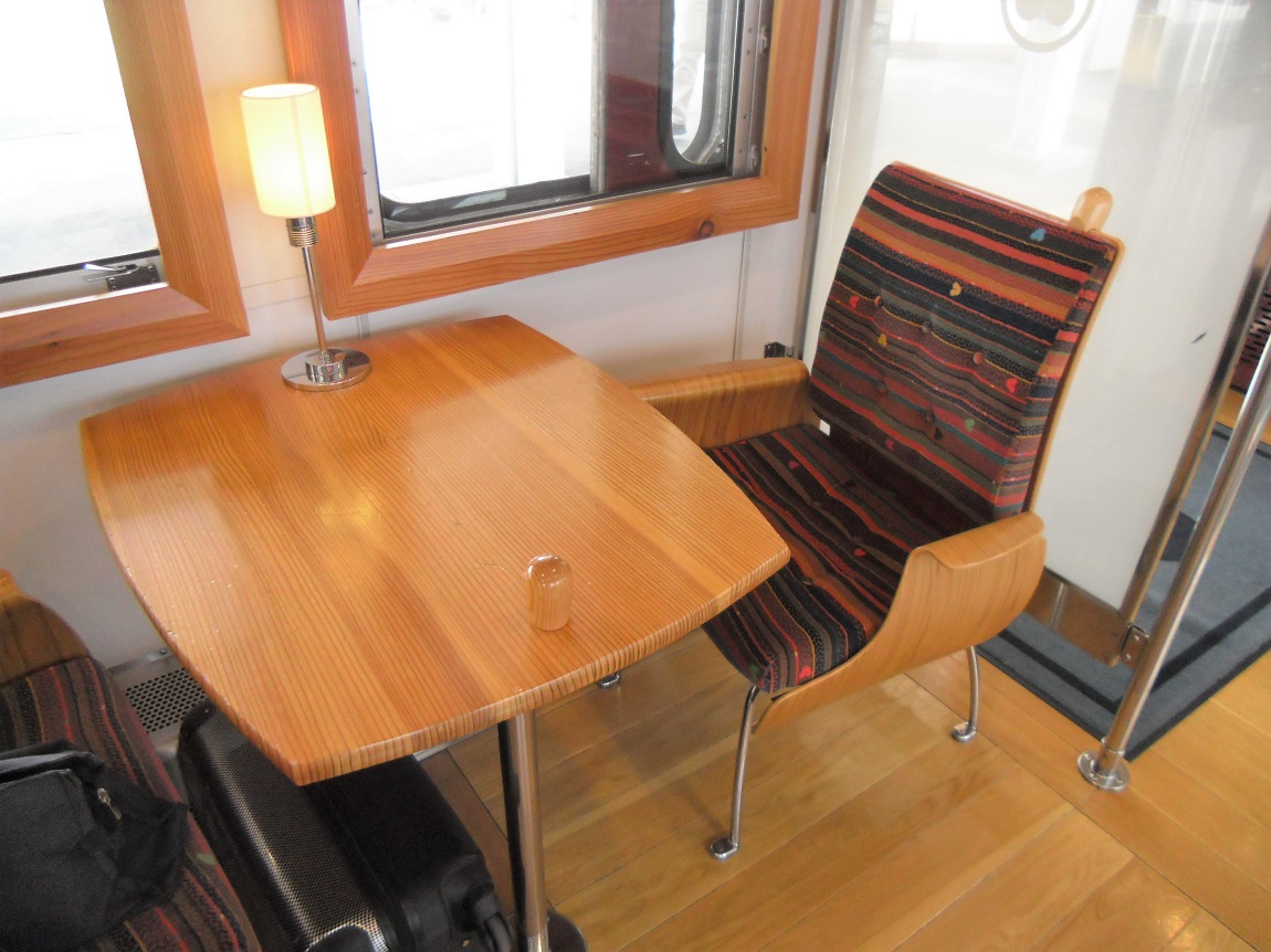 2人組の旅客が個室的な空間の中で食事を楽しめる車両となっています。バリアフリー対応のトイレも設置。