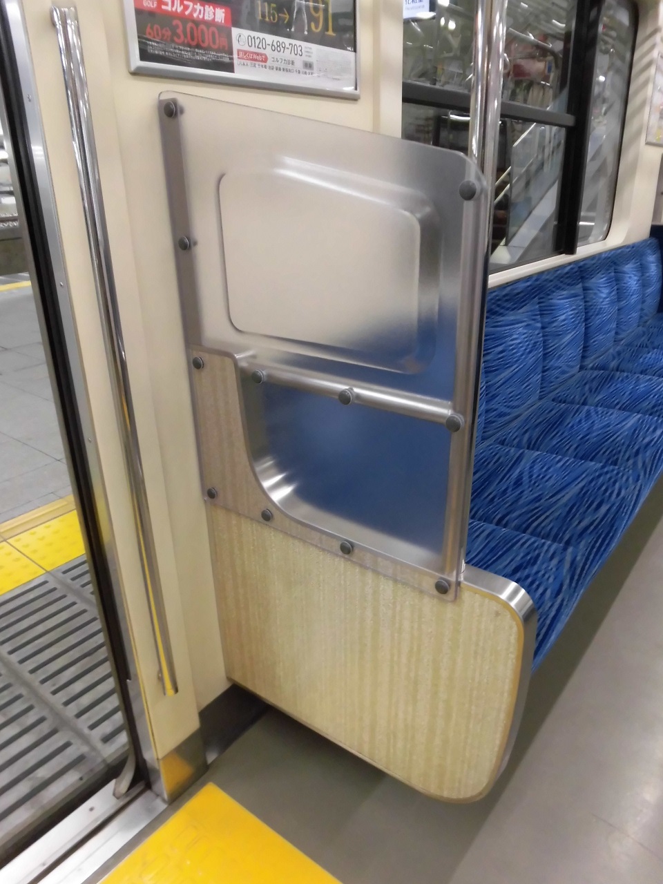 70-000形(後期車)ドア開閉(youtube) もともと4両だったりんかい線。後に6両編成となり、そして全線開通に伴い10両編成が登場することになりました。その際増備された車両(恐らく10両化の際に登場した車両のみ)は扉の形状が若干変化し、外からの見た目がいわゆる「209系扉」と同じものになりました。それでも内側には化粧板がはられているため、それまでの70-000形とイメージ自体は変わりません。現状、このタイプの扉を持つ70-000形が殆どとなっていますが、編成中間または先頭の何両かは初期の車両、という編成も勿論存在します。 ドアが動く時に音がすることを考えると、母体となった209系ではあまり数がいない空気式のドアエンジンを用いているものと思われます。 |