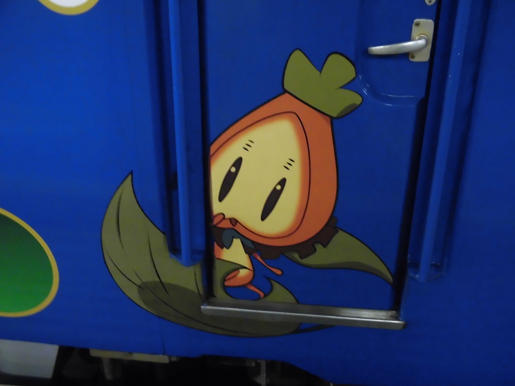 2016/3/19より、宮城県のご当地アニメ「政宗ダテニクル」と阿武隈急行がタイアップを行い、ラッピング車両「伊達なトレインプロジェクト」の運行を開始しました。運用は4年間の予定でしたが、2023年時点でもラッピングは継続中で、外装のみならず内装にも様々なキャラクターや観光案内が描かれています。 撮影地:梁川 |