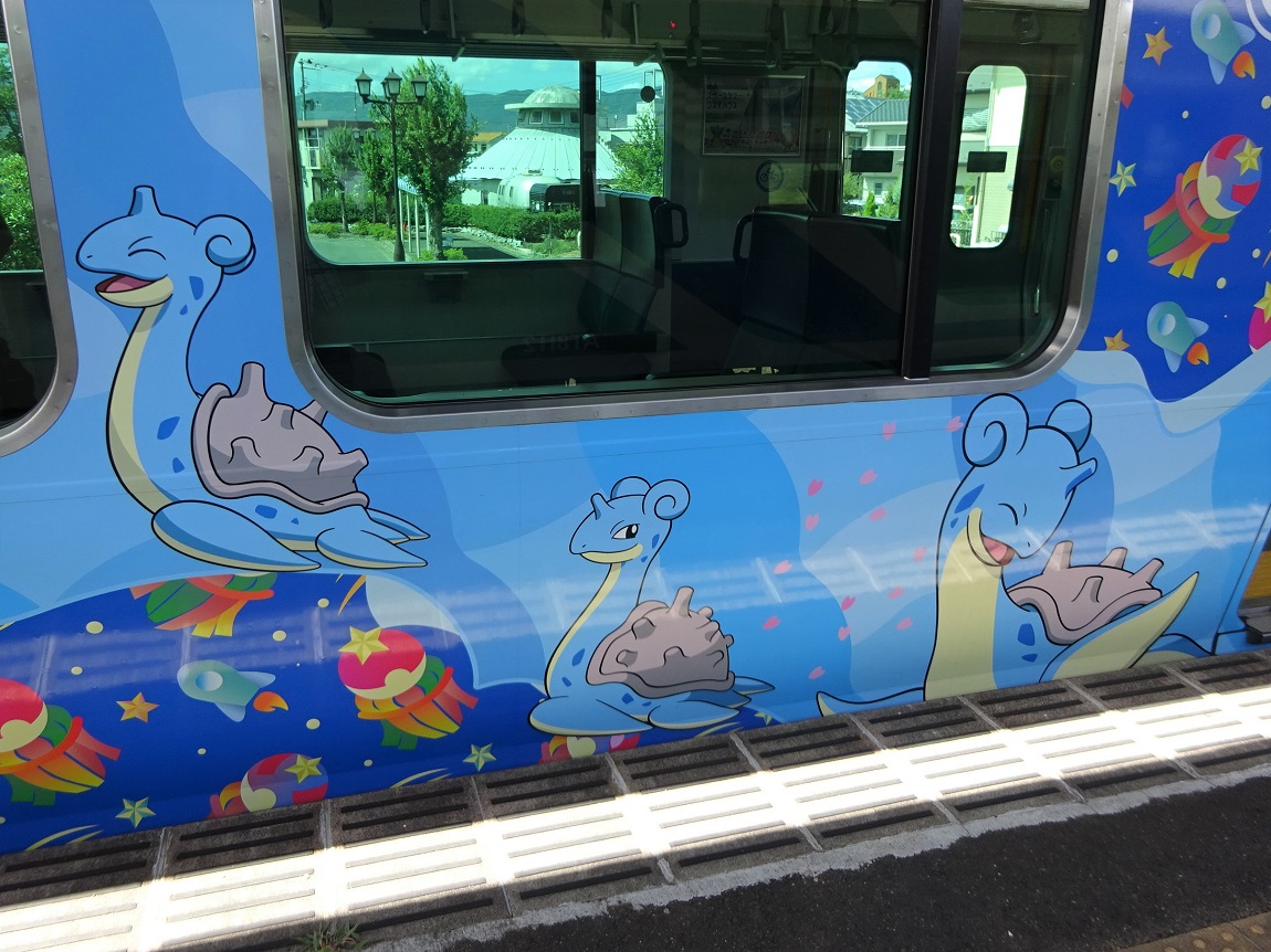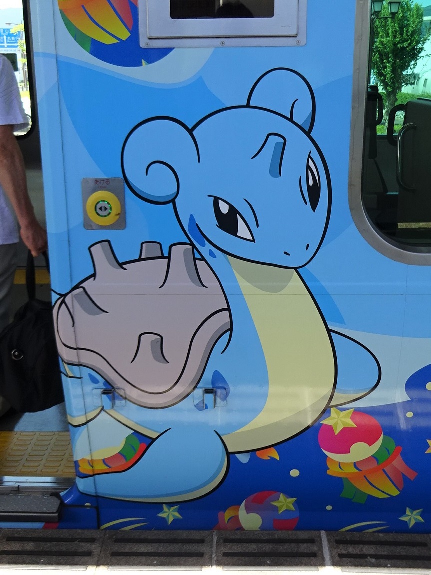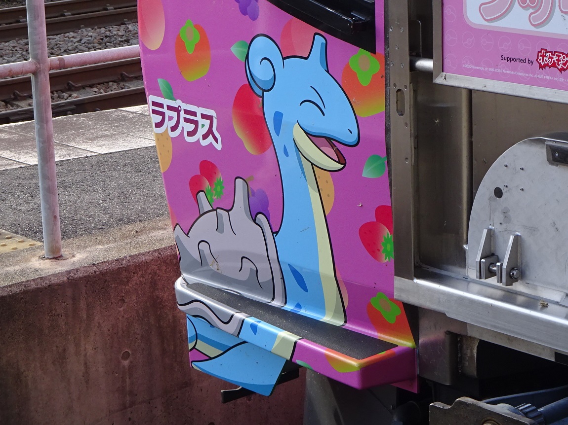 2022年7月より、福島県応援ポケモン「ラッキー」、宮城県応援ポケモン「ラプラス」とタイアップした編成が運行されています。ラッピングが施されているのは緑色の編成のAB-2編成。東日本大震災をはじめとして何かと激動の世の中、列車の運行によって県内外の利用客の誘致を図る事が出来れば、との思いが込められています。なお、車内は特にラッピングされている様子はありませんでした。 撮影地:福島 |
