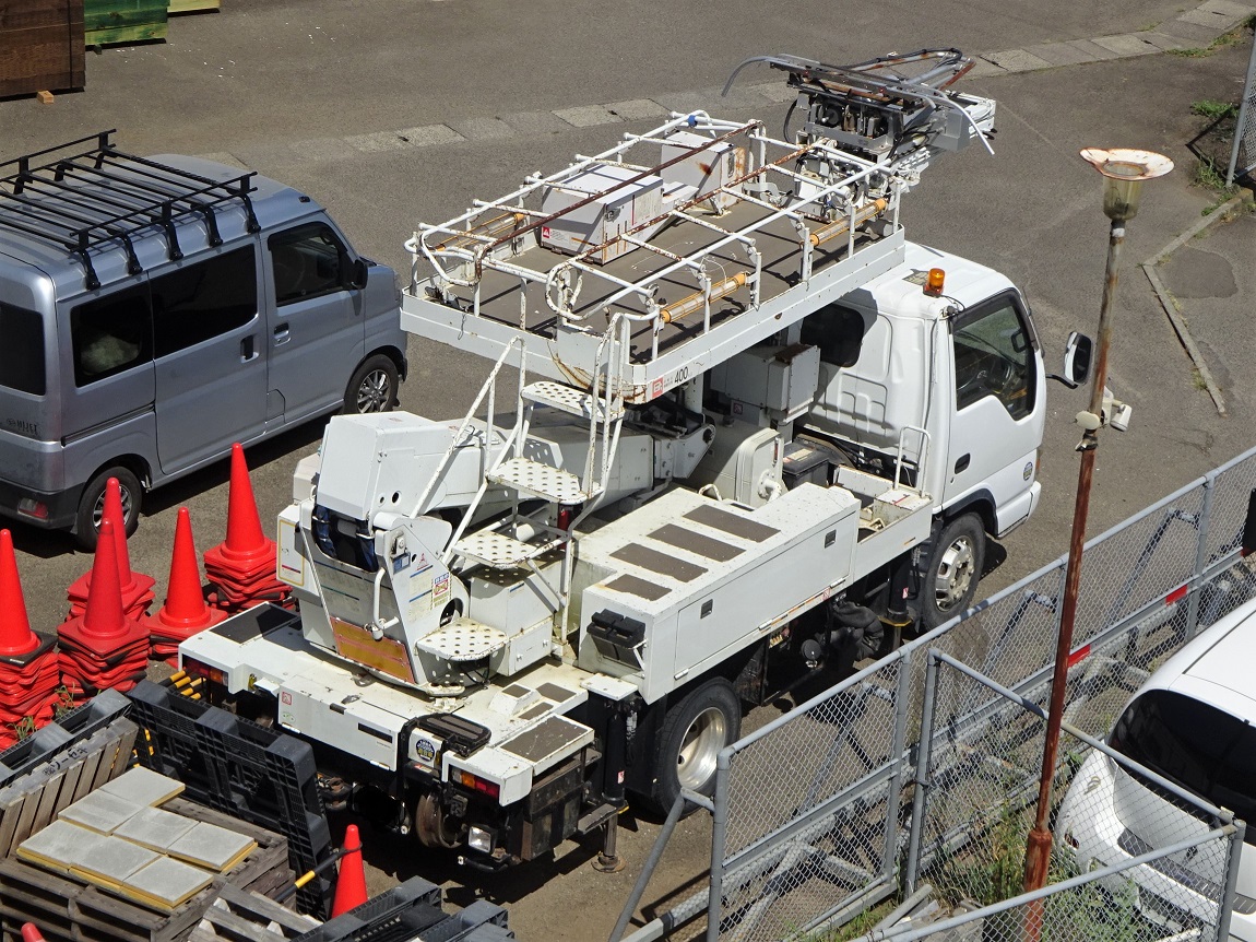 軌道作業車 軌道内に入る事が出来る作業用自動車でパンタグラフも搭載。一応自動車としてのナンバープレートには修正を入れてあります。 (左写真は梁川にて) |