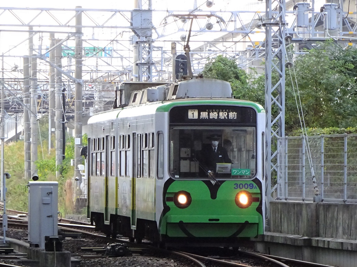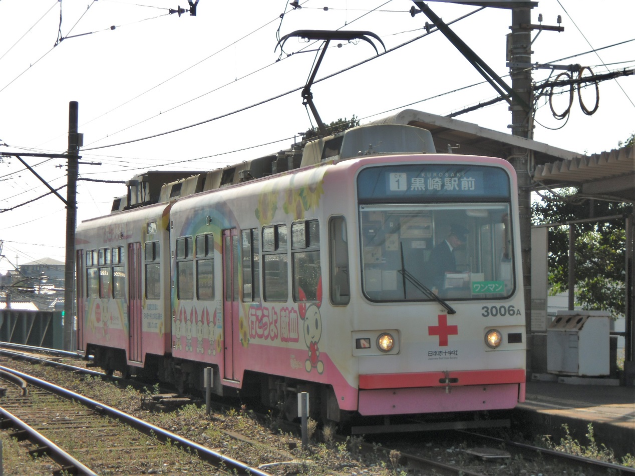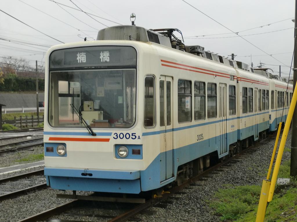 1988年に登場した2両連接車で、遅い登場ではありますが相変わらず吊り掛け式となりました。これは、主要機器に2000形の2両連接車のものを流用しているためで、見た目に反して随分と派手な音を立てる車両になりました。5000形が導入されるまでは、基本的にお昼の閑散時はこの車両のみで運行されていました。 近年はほとんどが全面広告を施した姿になっており、元々の塗装を見ることが出来ない状態が続いているようですが、リバイバルなどの特別塗装も度々施されているのでこれはこれで面白い状態だと言えそうです。 上写真は3003編成(楠橋にて) |