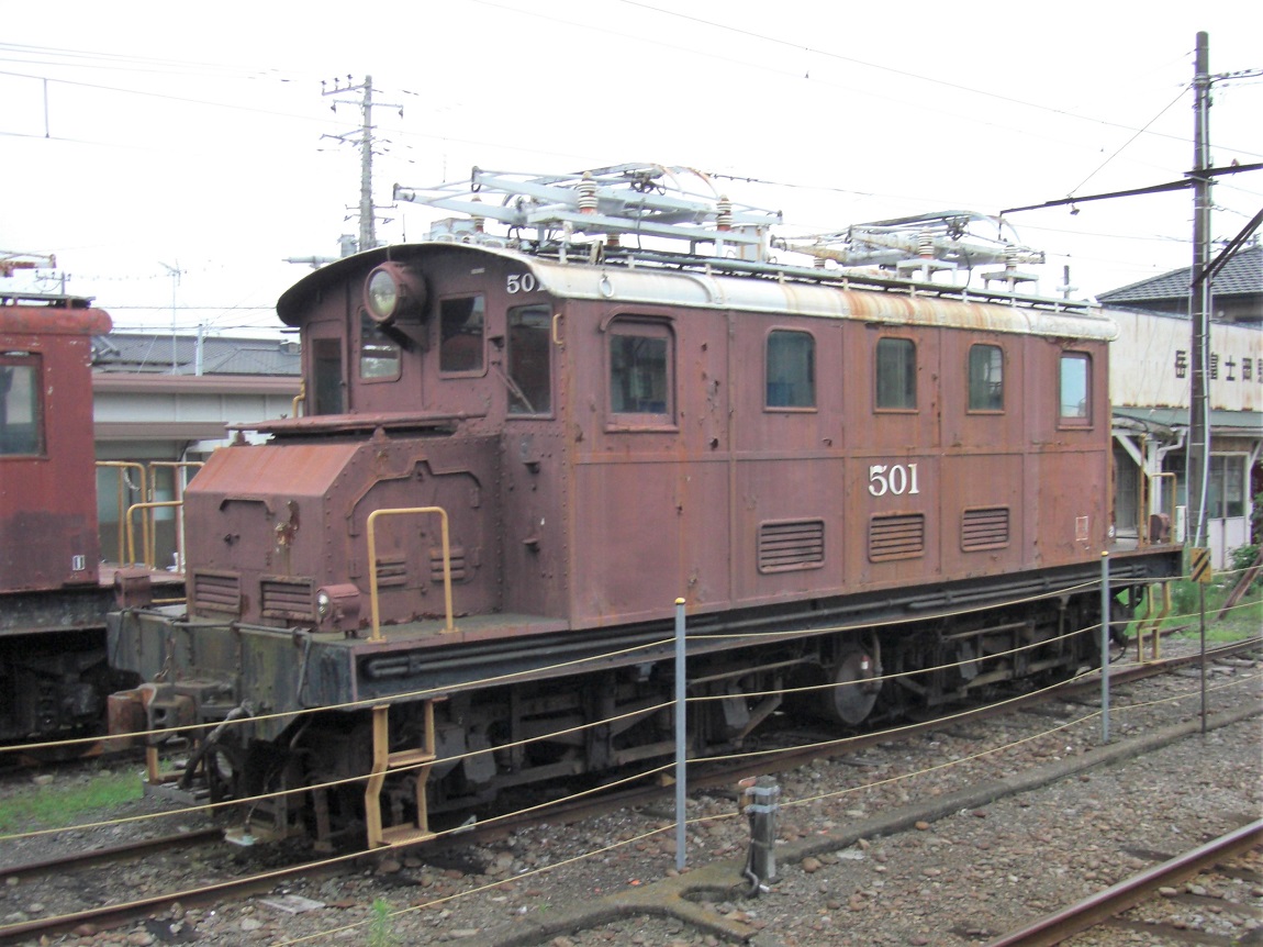元々は、上田温泉電軌(現在の上田交通)が1928年に導入した車両。1940年に三河鉄道(現在の名古屋鉄道)に譲渡され、1970年に岳南鉄道がそれを借りる形で導入しました。主に比奈駅の入替用に用いられており、当時定期的に用いられている電気機関車としては国内最古とされていました。 貨物運用が終了した後は岳南富士岡駅に留置されていましたが、そのまま2015年に除籍されており、現在は状態は今一つながらそのまま岳南富士岡駅に留置されています。 上写真はED50 1。比奈にて。 |