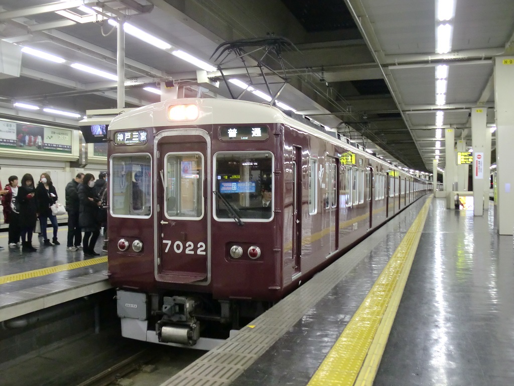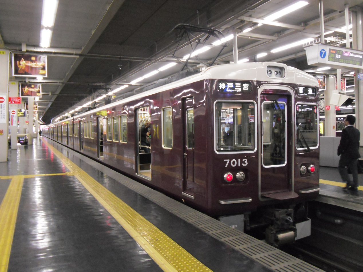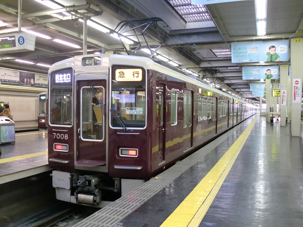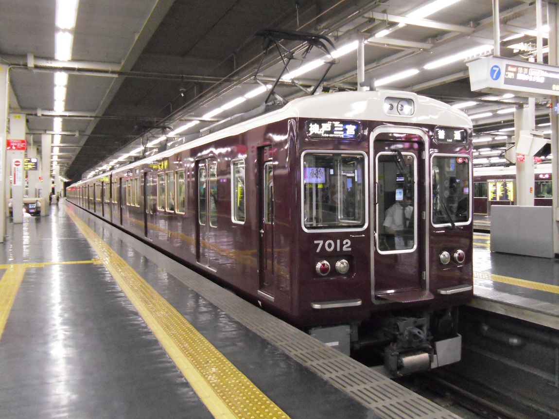 阪急1の大所帯(2018/12現在)となる車両で、6000系をベースとして1980年から登場しました。見た目からの違いは全くありませんが、走行装置が界磁チョッパに変更されているのが6000系との相違点。 更新に際しては、7300系の更新車のように劇的に見た目が変更された編成がいる一方で、ドア窓が大きくなっている点以外は見た目でわかる違いが無い編成も存在しています。詳しくは↓にて。 上写真は梅田にて。 |