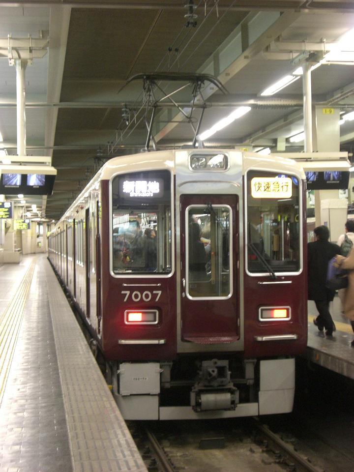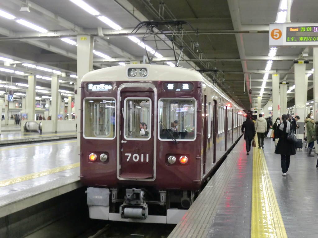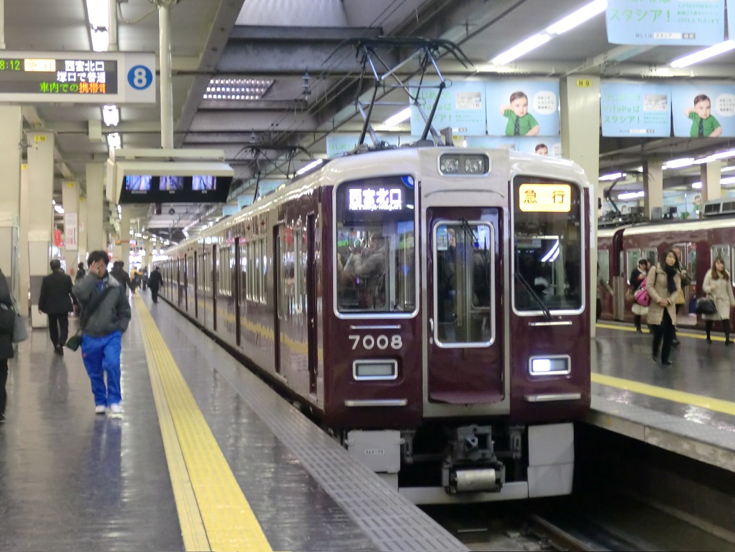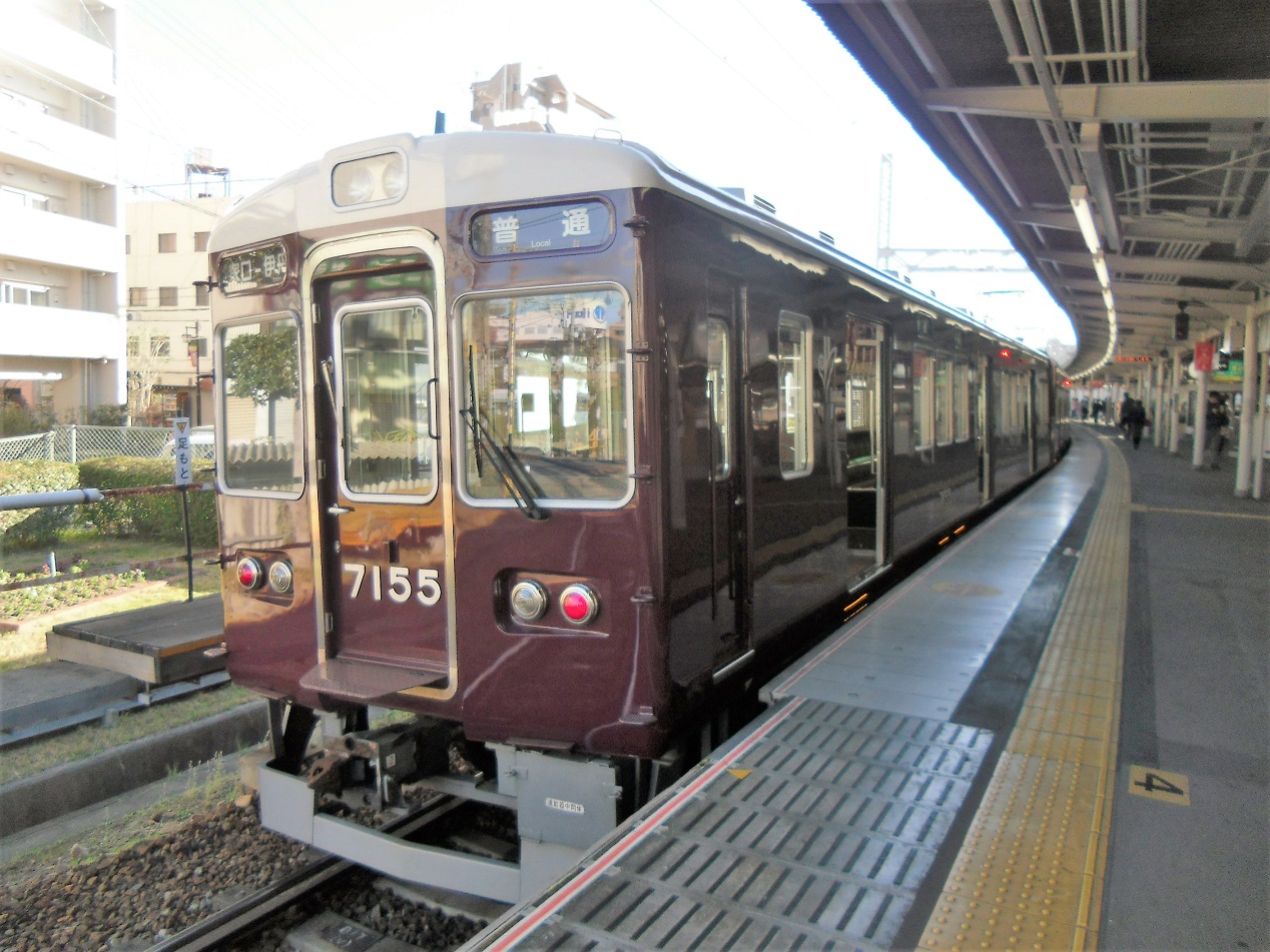阪急1の大所帯(2018/12現在)となる車両で、6000系をベースとして1980年から登場しました。見た目からの違いは全くありませんが、走行装置が界磁チョッパに変更されているのが6000系との相違点。 更新に際しては、7300系の更新車のように劇的に見た目が変更された編成がいる一方で、ドア窓が大きくなっている点以外は見た目でわかる違いが無い編成も存在しています。詳しくは↓にて。 上写真は梅田にて。 |