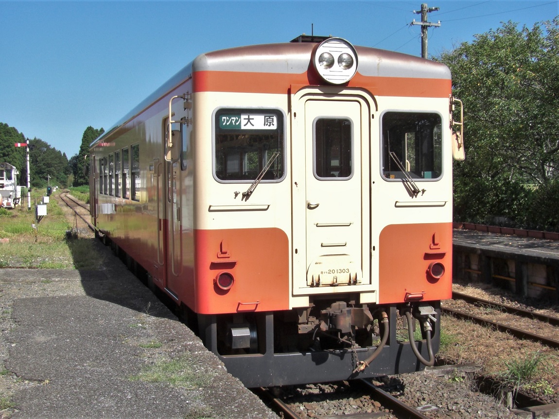 見ての通り、国鉄が1957年に登場させたキハ20を譲渡したもの…と言ったら何人騙せるでしょうか。この車両はキハ20を模したスタイルにいすみ鉄道カラーを合わせて登場したキハ350の増備型として登場した車両で、内装はクロスシートに戻っています。見た目も国鉄色にしてしまったのが一番の違い。正直、側面を見なければ本当にキハ20にしか見えません。よくできています。