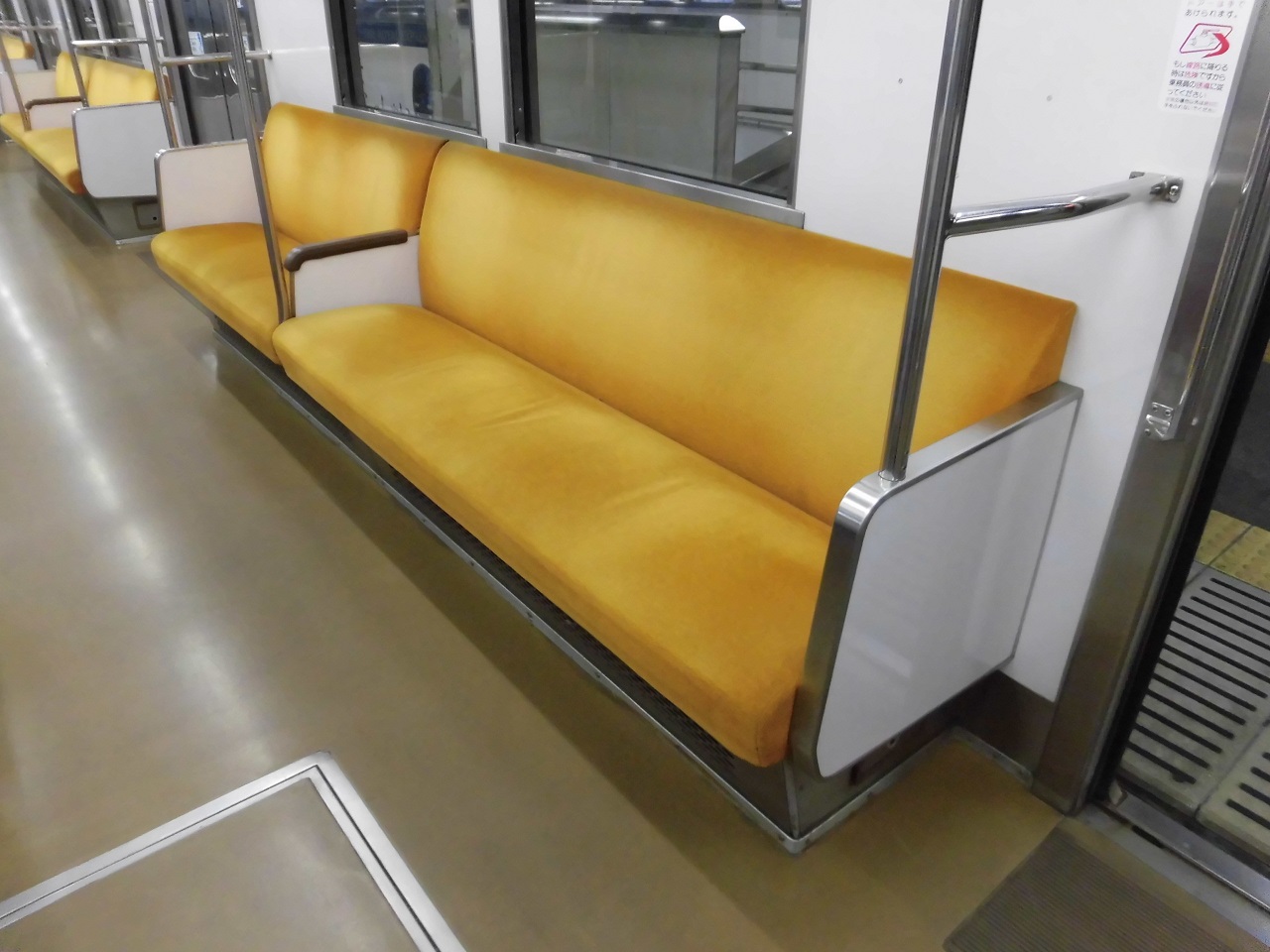 8000系ドア開閉(youtube) ドア上にLED(青一色)が設置され、変わった音のドアチャイムが設置されましたが、それ以外は東急時代と同じです。車内は海側の座席がボックスシートになっていますが、山側の座席に東急時代の面影を感じることができます。 | |