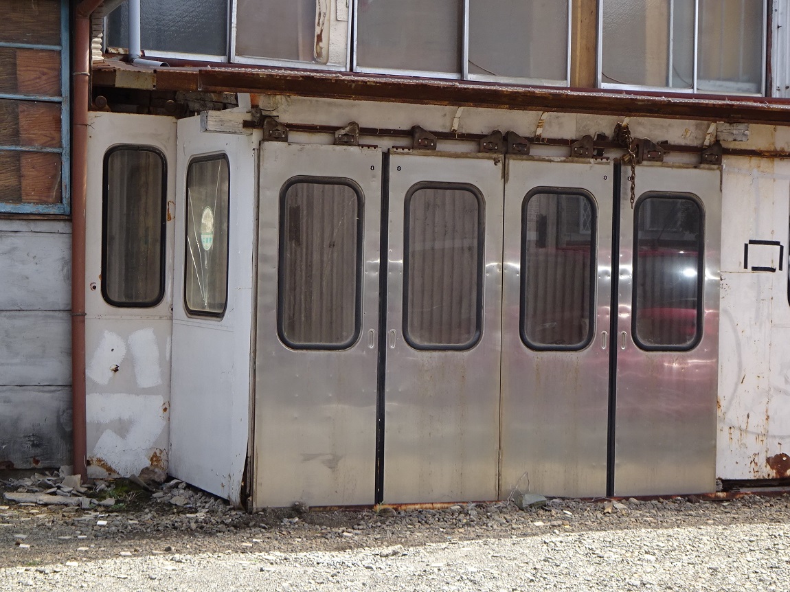 廃品の扉 廃車された100/150/200形辺りから転用したのでしょうか。高崎構内の車両工場の壁の一部には車両の扉が再利用されています。 |