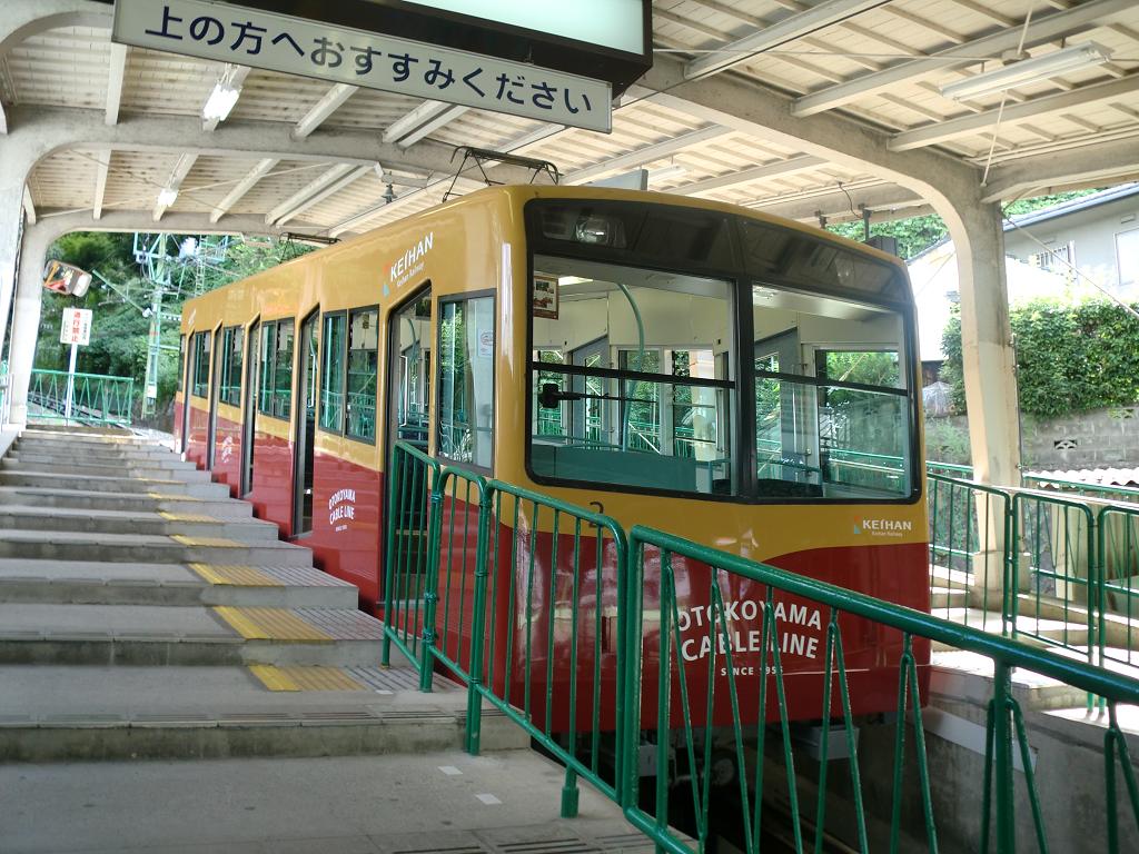 京阪電車の八幡市駅から発着している男山ケーブル。これに乗ると石清水八幡宮へ行くことが出来るわけですが、ここの2代目のケーブルカーがこの車両。形式はありませんが車両番号はあり、1号と2号の2両が在籍しています。何故か京阪特急色をしたこのケーブルカー、5扉もある大型車両で、よそのケーブルカーと比べると随分と質の高い車両のように思えます。