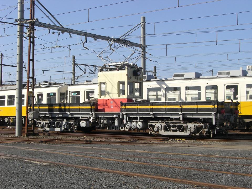 1957年に登場した電動貨車で、2軸の貨車の台枠など、ありあわせの部品を組み合わせて製造された車両で、車体は木造。ATSを装備していないため、基本的に普段は仏生山の車庫の中に留置されています。 2008年には部品交換等の更新工事が施行されました。 上写真は仏生山駅付近にて。 |