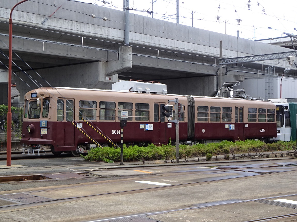 1960年に西日本鉄道が持て余していた車両を購入して登場しました。9700形等のLRT車両を除くと唯一の連接車。現在はラッシュ時や多客時に時々出てくるのみで、殆どの時間を上熊本の車庫で過ごしています。2本が存在していますが、このうち5014は西鉄時代の塗装をそのまま踏襲しており、昔を懐かしむことのできる存在と言うことができるかもしれません。5015は後に登場したLRTの9700形に準じた塗装に変更され、ロゴも整備されました。 現在、5015が廃車された一方で、5014が再整備を受け、平日の朝ラッシュ時に運行されています。 上写真は5014(上熊本駅前にて) |