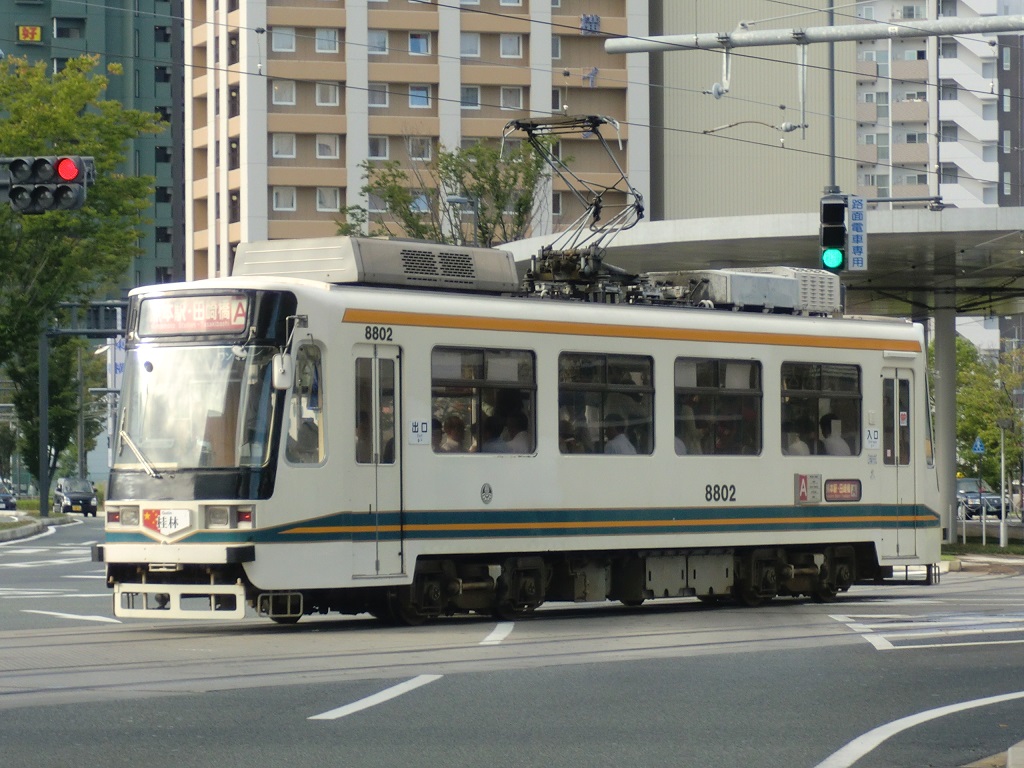 8200形に引き続き、在来車の代替を目的に導入された車両で、例に違わず、1988年の登場だから「88」00形、ということになっています。デザインが大きく変更され、見た目は何だかスマートになりました。が、何故か前後扉に変更され、その上扉のサイズも小さくなったのでいまいち使いづらそうな印象…。次に導入された9200形では元の扉配置に戻っている為、少々異端な存在となってしまっています。 尚、レトロ車両となっている101号も8800形の一員。とはいえ、扉配置は9200形と同じものになっています。 上写真は8802(熊本駅前にて) |