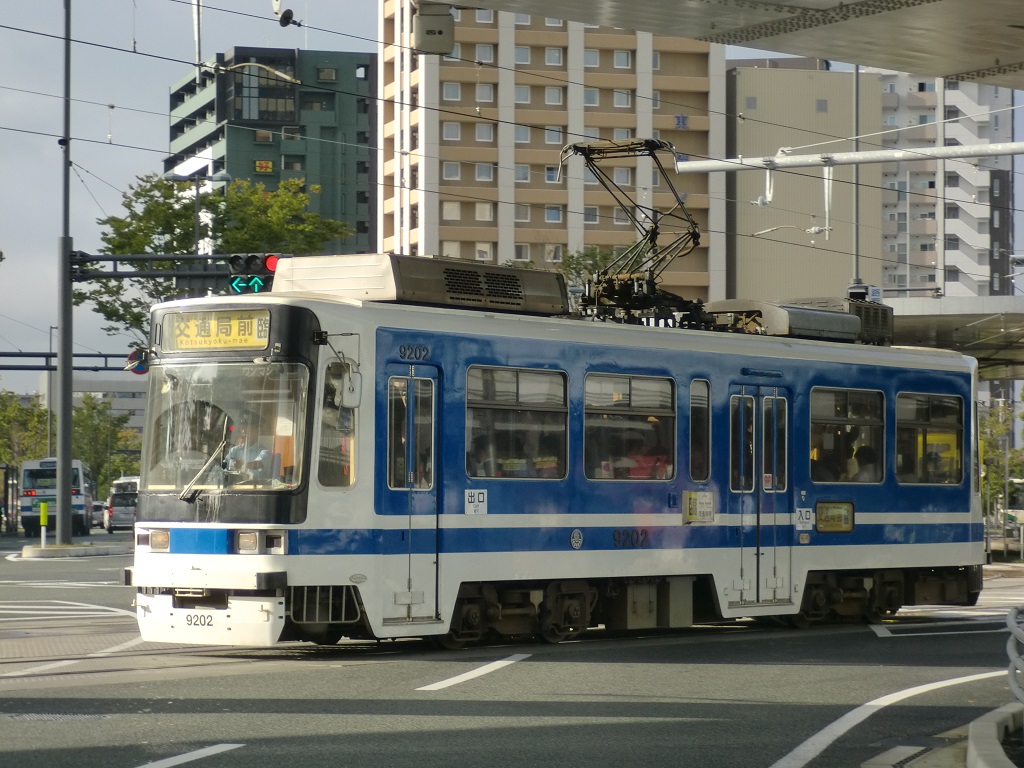 1992年度に導入されたので9200形。…もうだいたいお察しの事かと思いますが、熊本市電は8200形以降、全てこの番号の振り方で形式をつけています。 9201号は熊本市の姉妹都市となるハイデルベルクの愛称があり、車内にもハイデルベルクを紹介するパネルが掲示されているほか、ドイツ語で車内放送が放送される徹底っぷり。基本的なデザインは8800形と変わりませんが、前面の傾斜がゆるくなったほか、扉配置が元の位置に戻っています。やはり、こちらの方が使いやすかったのでしょう。 左写真は9202(熊本駅前にて) |