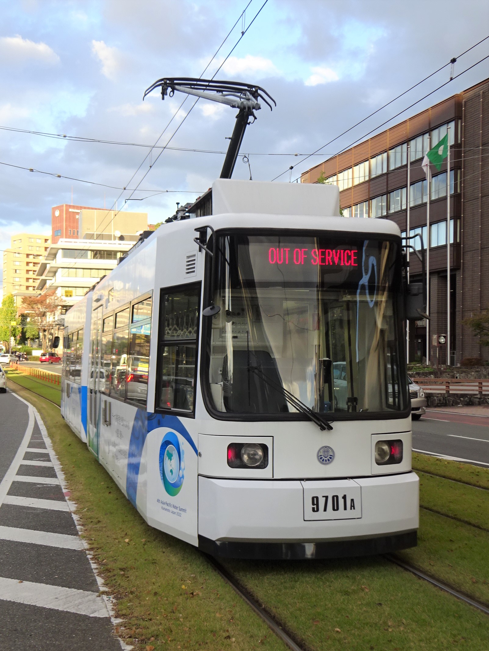 日本初の低床LRT車両として導入された車両で、1997年の登場。勿論ローレル賞を受賞し、この他に第19回国際交通安全学会賞…というものも受賞しました。それだけ、この車両の導入は歴史的だった、というわけです。後に、標準的な車体となったLRTが沢山登場しましたが、それらと比べると大分直線的なデザインにまとめられています。尚、車両内外の塗装デザインにはJR九州と同じく水戸岡鋭治が携わっています。
