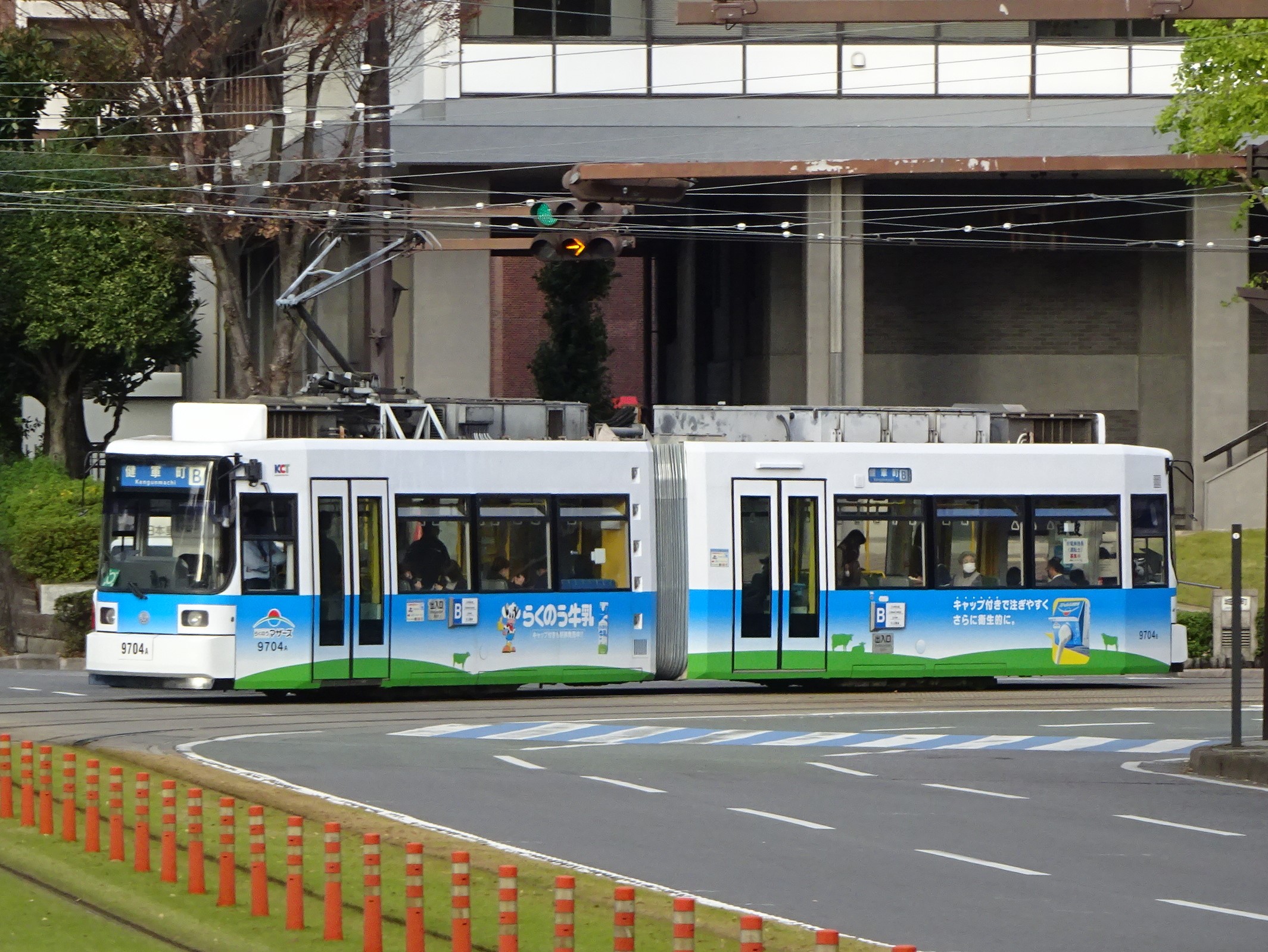 2車体連接の低床車をはじめて導入したのが熊本市電の9700形。後に登場した0800形は他の地方でもよく見られるような形の車両になりました。モーターはどちらも路面電車ではよくある三菱IGBTです。